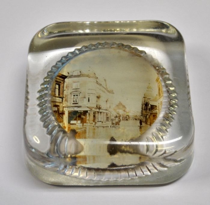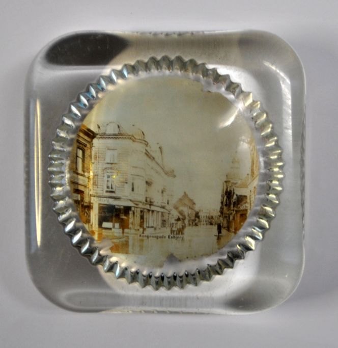 Brevvægt i klart glas med foto af Kongensgade i Esbjerg, ca. 1900. Danmark. 7,5 x 7,5 x 2,7 cm.
