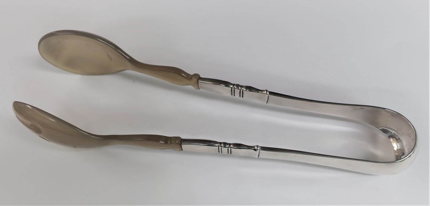 Evald Nielsen. Stor salat tang. Sølv med ben (830). Længde 26 cm. Produceret 1927.