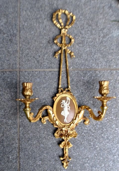 Fransk væg applik i lueforgyldt bronze, Louis XVI stil, 19. årh. Med plaquette af dansende pige i bisquit porcelæn. . Højde.:46,5 cm. B.: 26 cm.