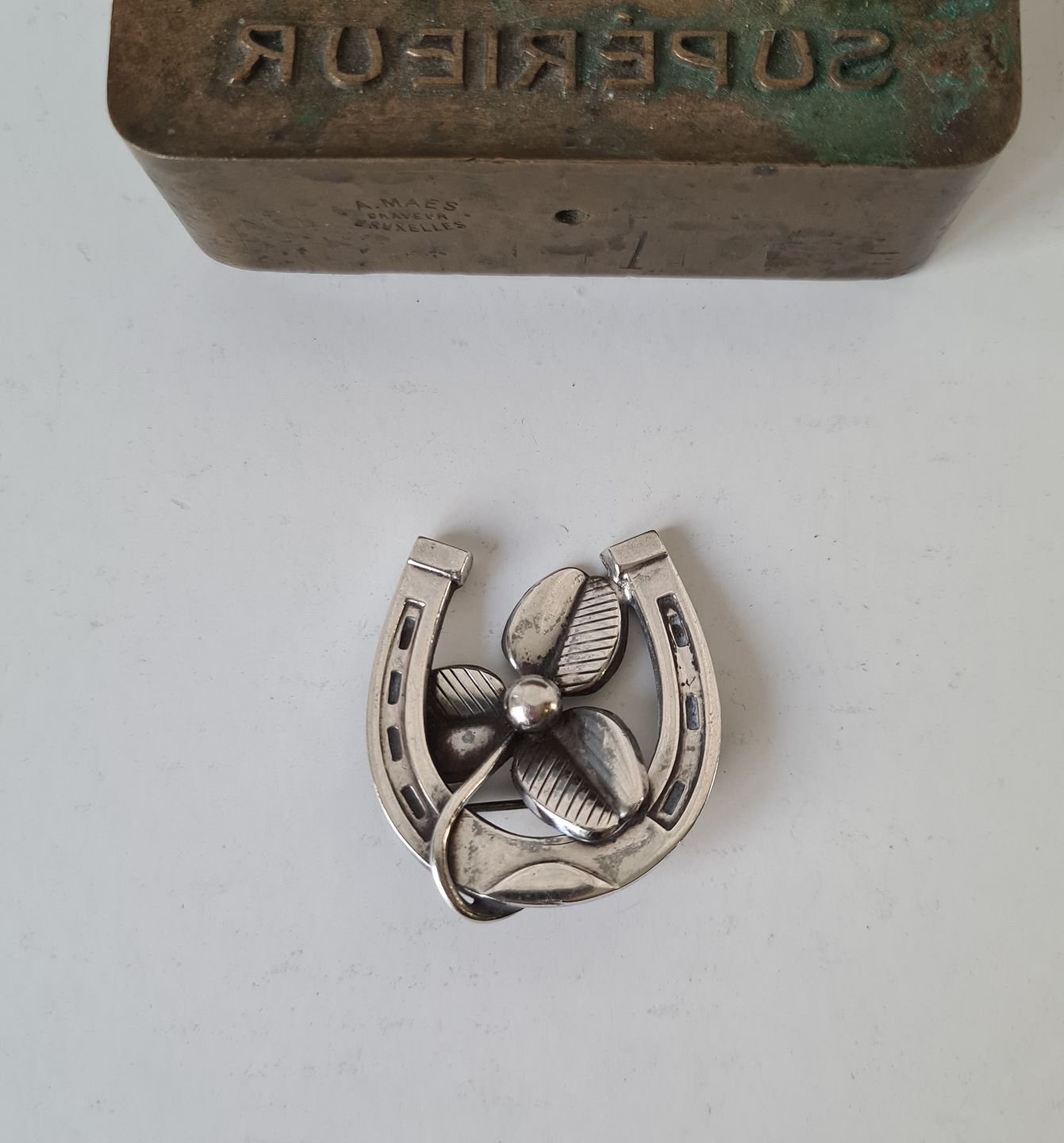 Vintage silver brooch in the form of horseshoes with three-leaf clover