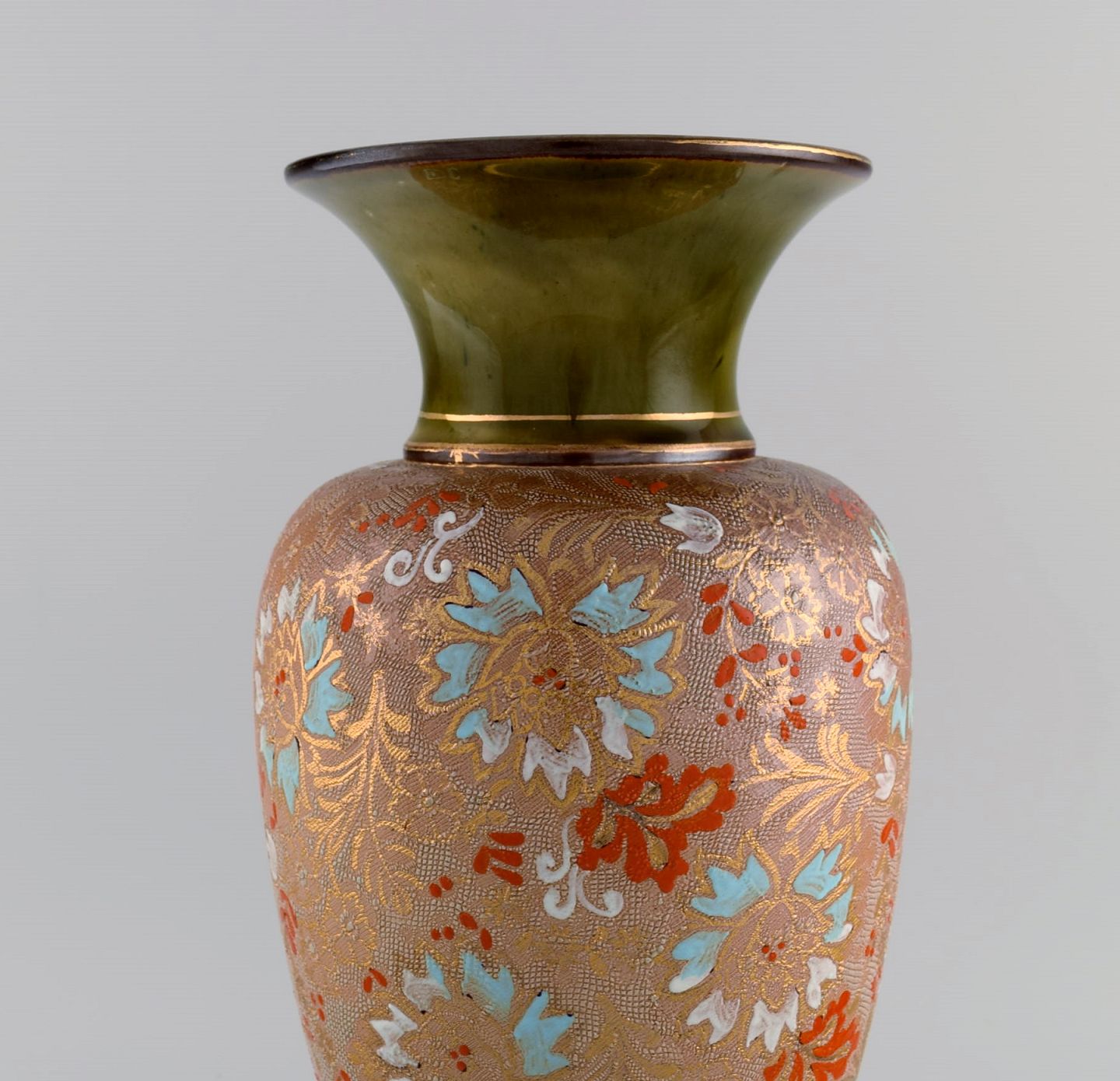 Stor Doulton Lambeth vase i lertøj med håndmalede blomster og gulddekoration. Tidligt 1900-tallet.