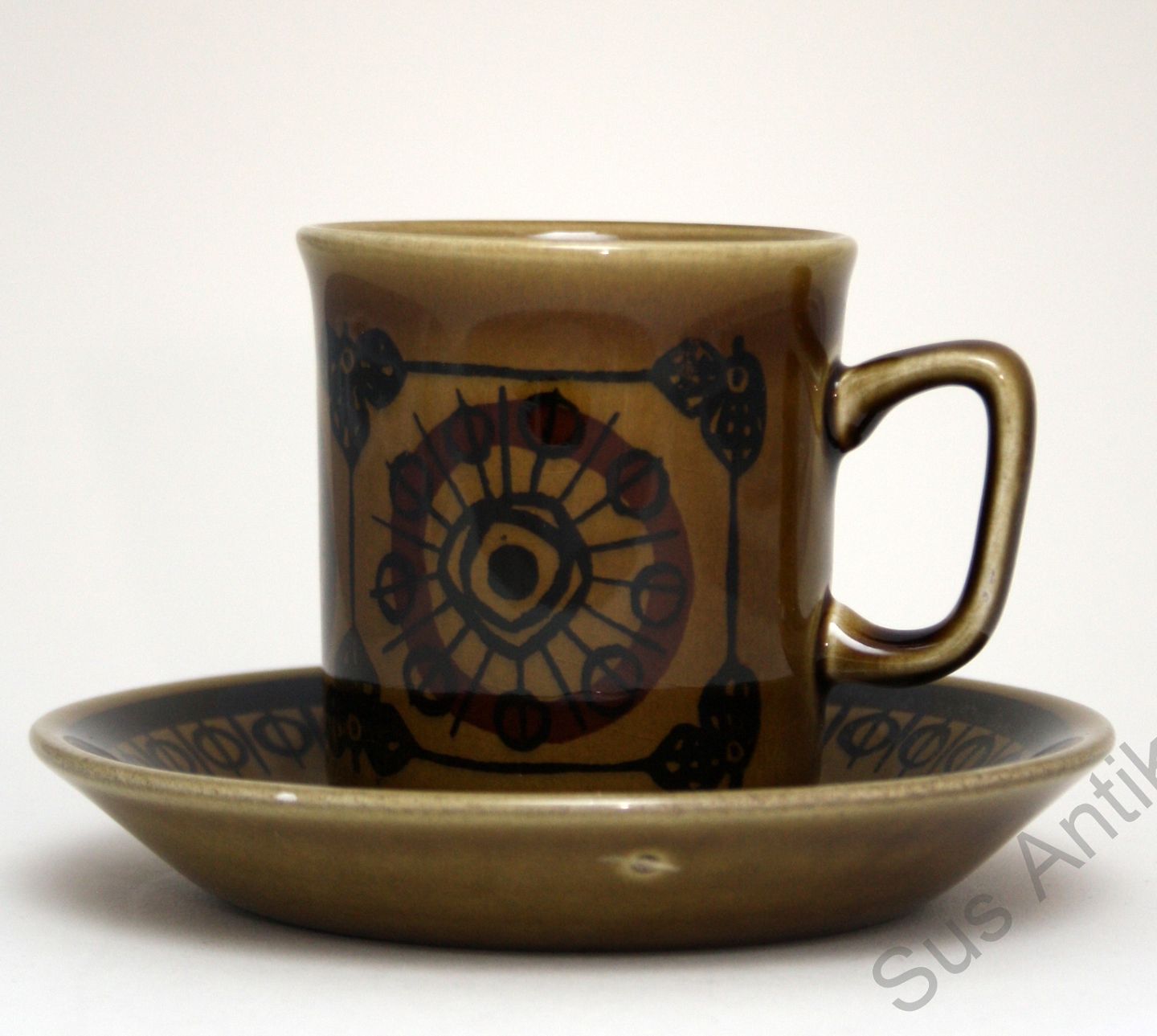 Stavangerflint, Norway, Sera. Dekoreret af Inger Vaage og designet af Kåre Berven Fjeldsaa. Kaffekop med underkop. Højde 7,5 cm. Diameter 6,5 cm. Lettere overfladekrakelering på enkelte. Pris: 75 kr. stk. Lager: 1