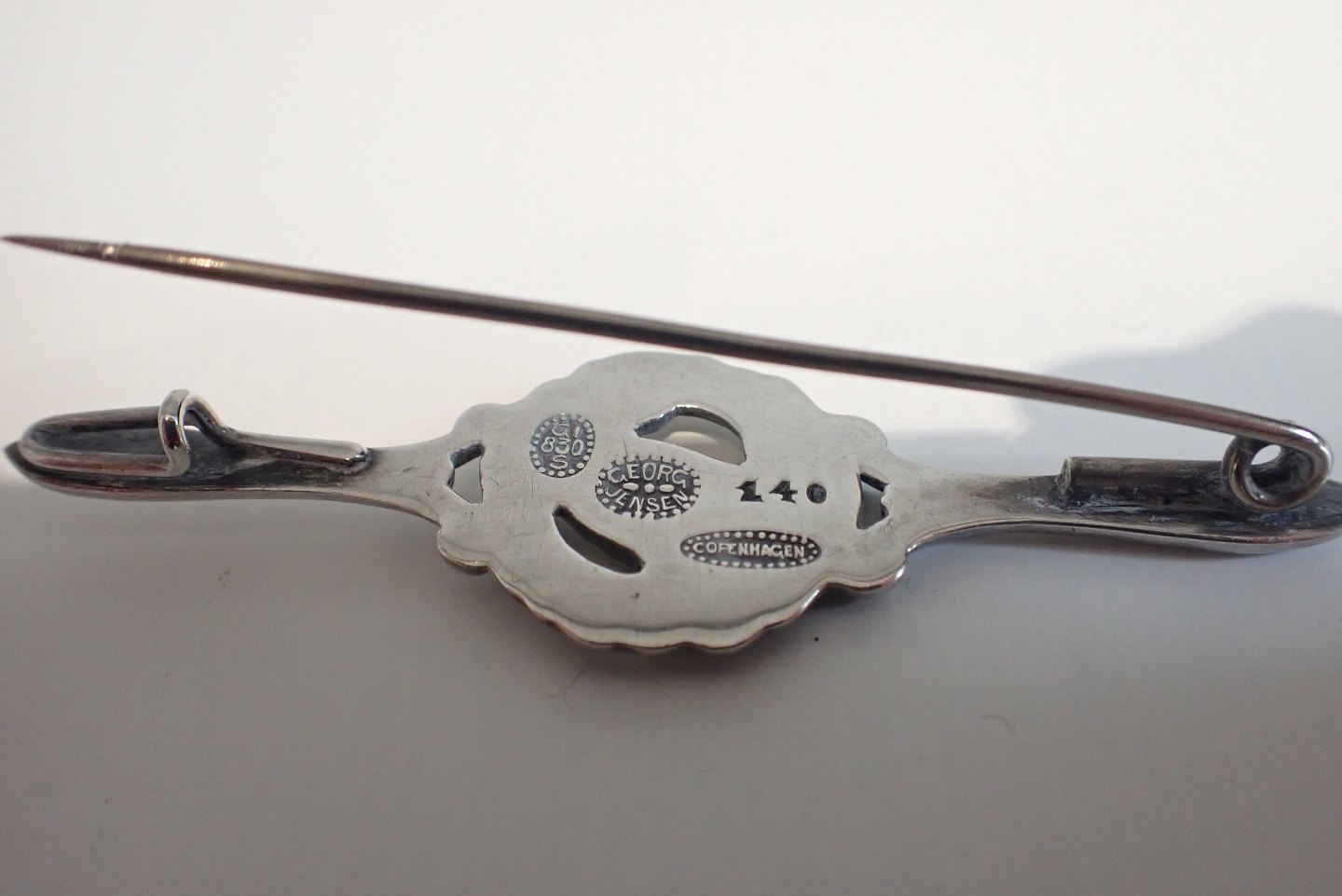 Georg Jensen - stangbroche med duen i krans i 830 sølv. Dessin nr. 140. Stempel fra perioden 1915 - 1922. Sikkerhedsnåls lukning. Vægt: 7,9 gram. Længde: 8 cm. Brede på dekoration: 2,3 cm. I fin stand.