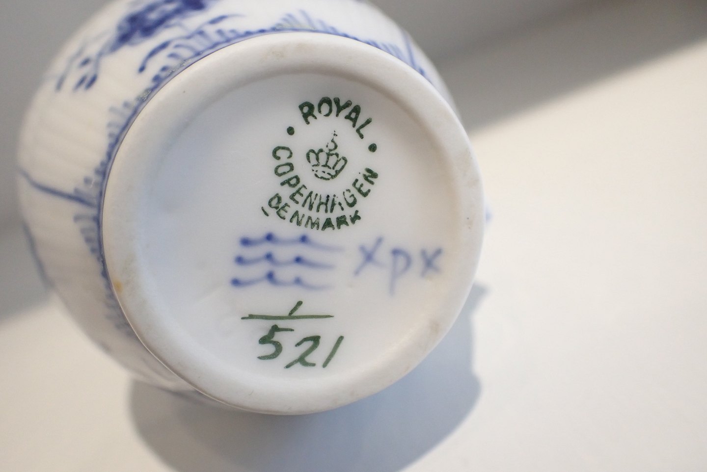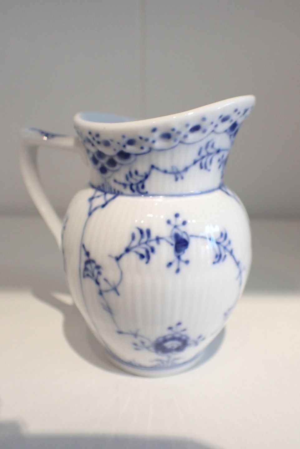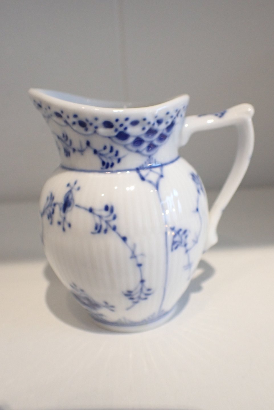 Kgl. Porcelæn musselmalet halvblonde flødekande. Dessin nr. 521. Efter 1923. 1.sortering. Højde: 8 cm. I fin stand.