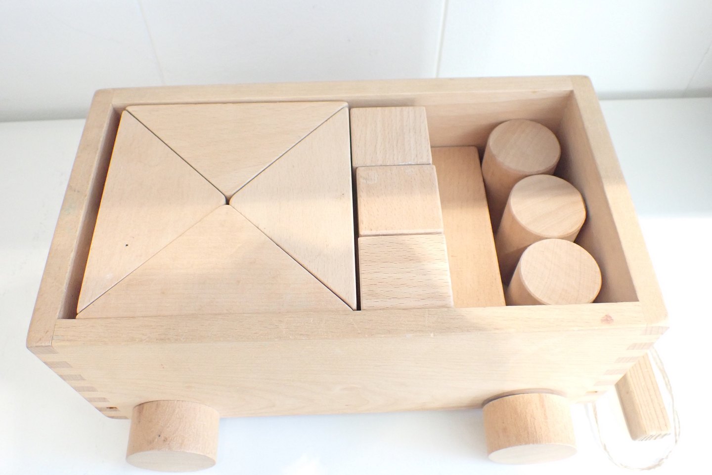 Text available in Danish: Kay Bojesen trækvogn med klodser.