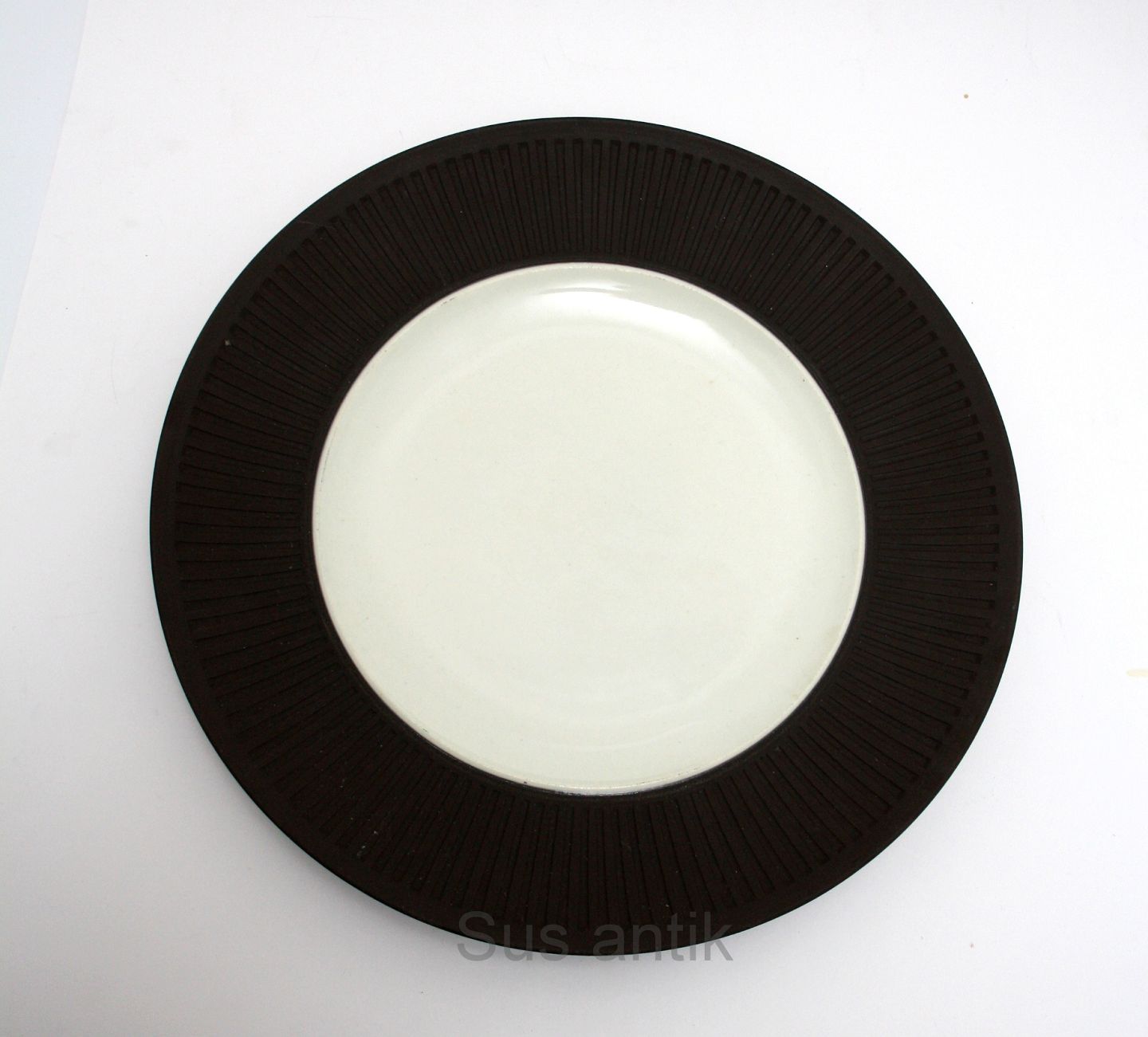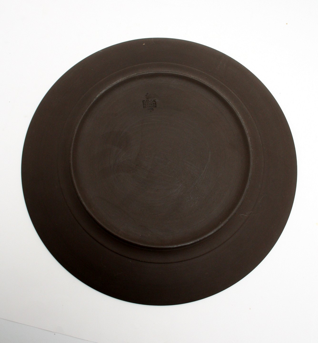 Text available in Danish: Eslau Danmark. Dækketallerken, stor middagstallerken. Indvendig hvid glasur, yderside i rå uglaseret stentøj. Designet af Jens Harald Quistgaard i 1950,erne. Signeret IHQ, Dansk Designs, Denmark.