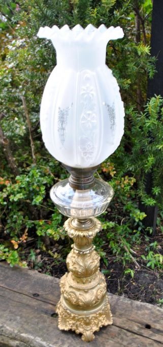 Gilded bronze petroleum lamp, 19th century France. Foot decorated with rocailles and foliage. Crystal container. Top of the stained glass and dome in blown glass with motif. In the lower part drilled hole, as it has previously been made for electricity. H .: 75 cm.