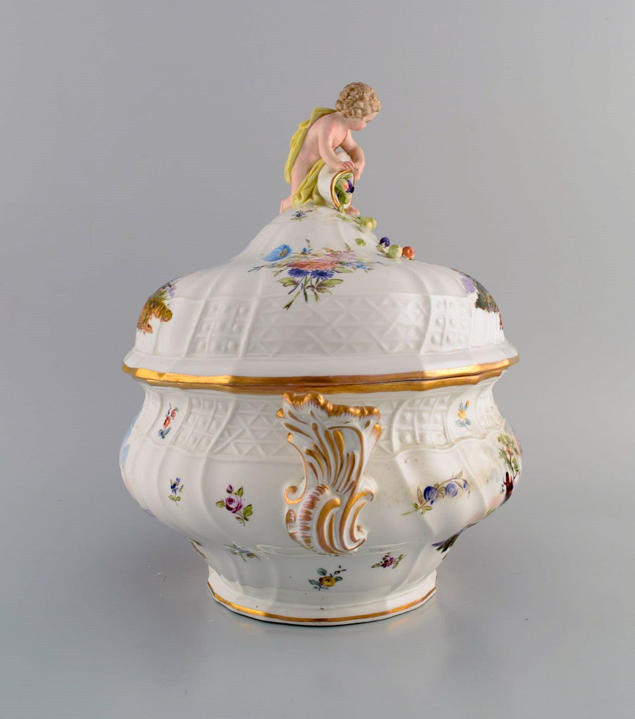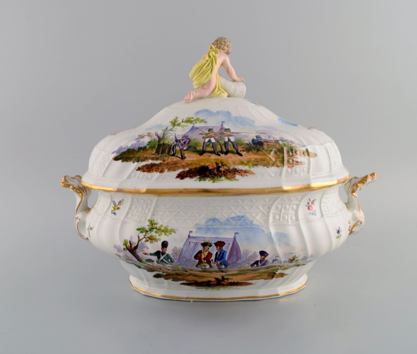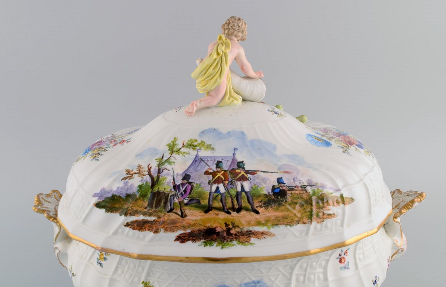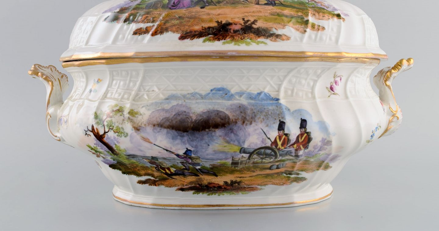Stor antik Meissen lågterrin i håndmalet porcelæn. Militærscener og putti med overflødighedshorn. Museumskvalitet, midt 1800-tallet.