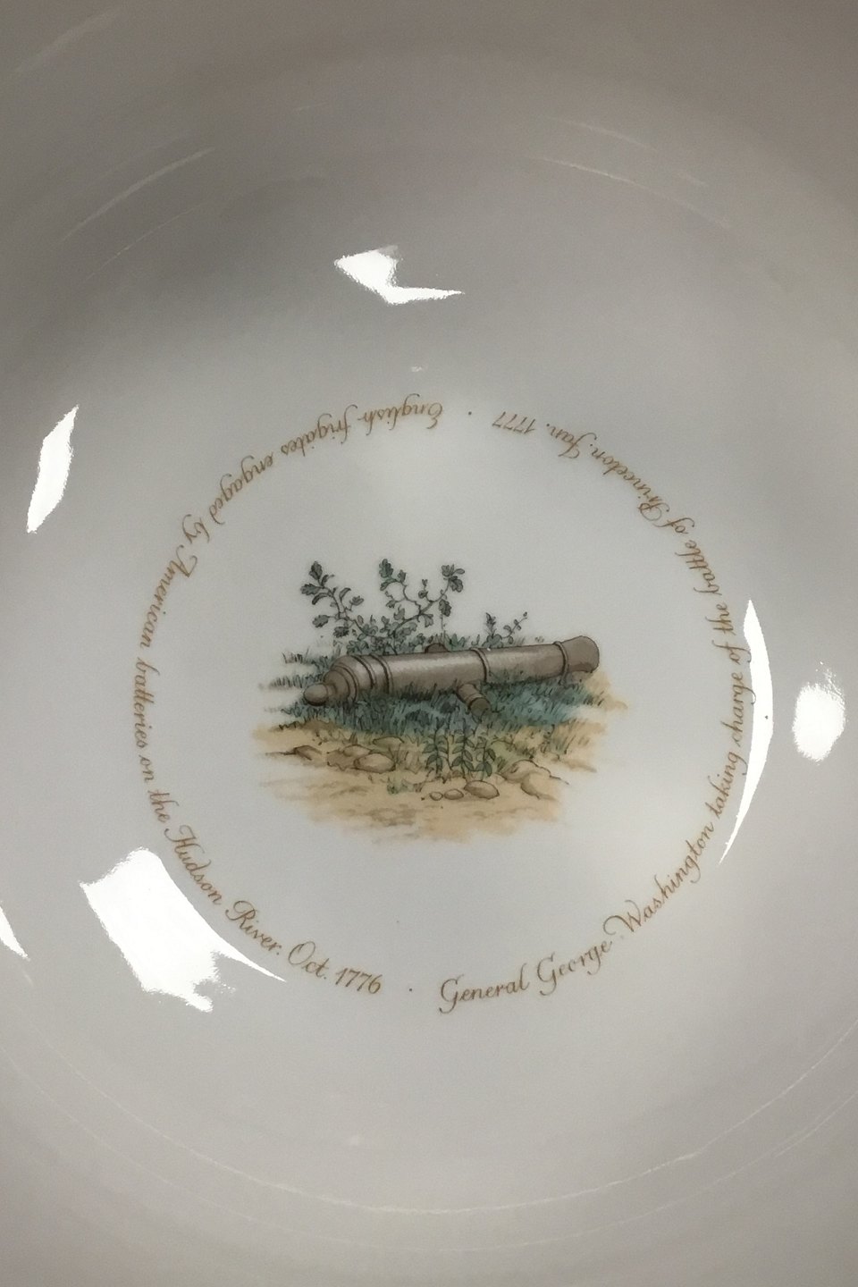 Royal Copenhagen Commemorative Bowl 1775-1975 Decorated in colour and gold scenery of the USA 1776-1976 200th Anniversary of The American Revolution. Measures H 15 cm (5 29/32 in) Diam 33 cm (13 in), 1st quality. Year of issue: 1976 in 2500 copies.
