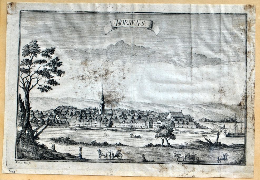 Lode, Alexia de (1737 - 1765) Danmark:Vue over Horsens Købstad. Kobberstik. Signeret. 18 x 25,5 cm.