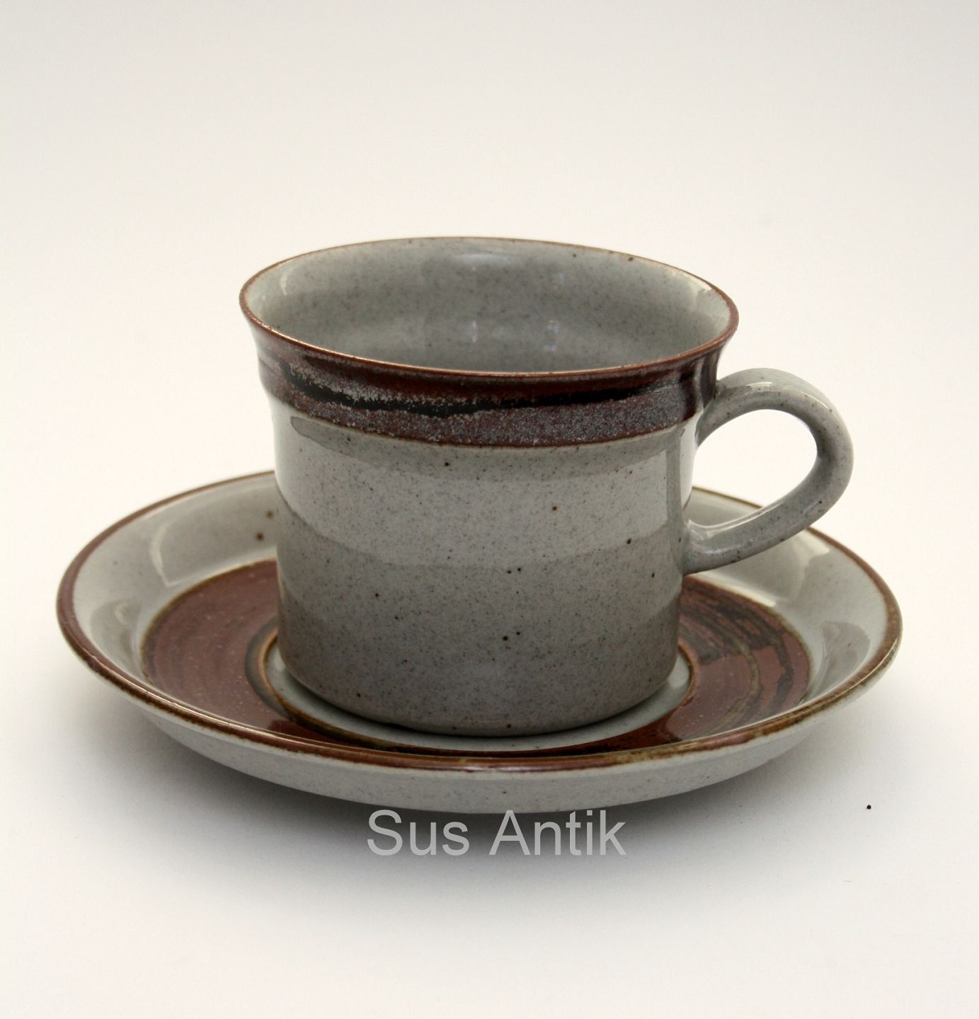 Text available in Danish: Knabstrup stoneware, Ingrid stentøjsstel grå glasur med brun kant. Designet af den tyske kunstner Christine Konschak, som var tilknyttet Knabstrup i perioden 1967-1970.