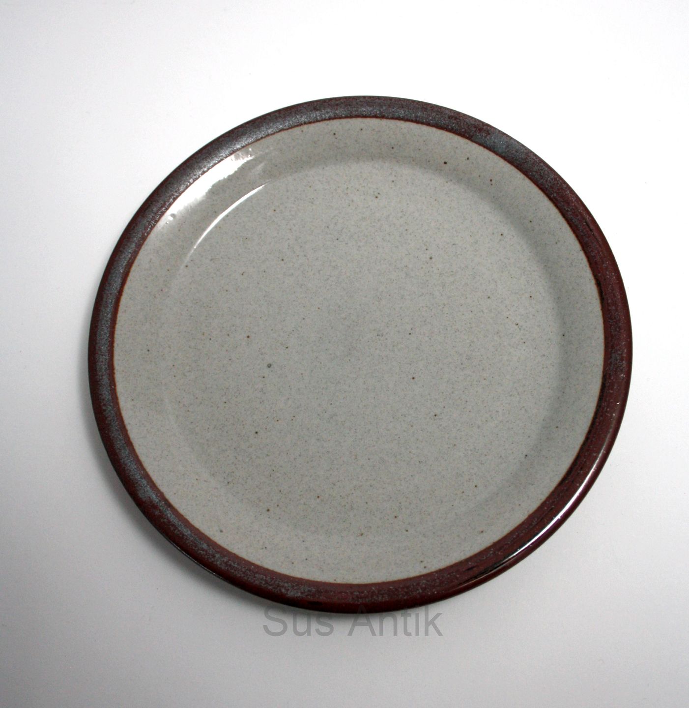 Text available in Danish: Knabstrup stoneware, Ingrid stentøjsstel grå glasur med brun kant. Designet af den tyske kunstner Christine Konschak, som var tilknyttet Knabstrup i perioden 1967-1970.
