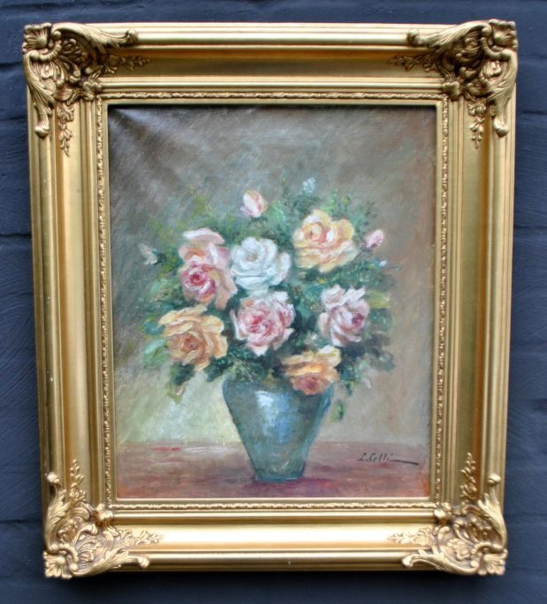 Celli, L (20, årh): Roser i en vase på et bord. Olie på lærred. Signeret. 47 x 39 cm.