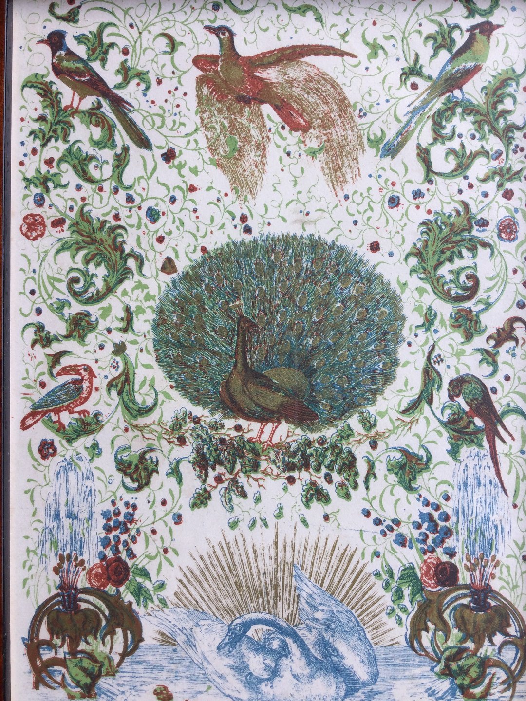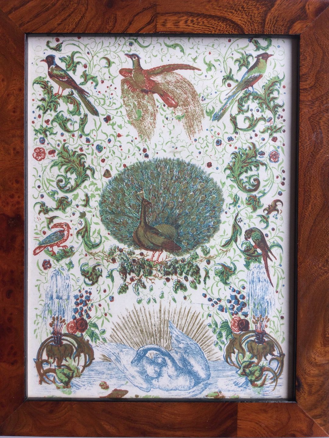 Text available in Danish: Litografi - komposition med påfugl og andre fugle - prøveark.