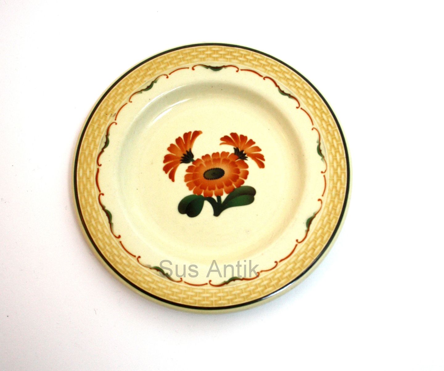 Aluminia, Morgenfrue. Designet af Niels Thorsson. Produceret i perioden 1934-1967. Luftmalet. Kagetallerken. Diameter 16 cm. Fin stand. Pris: 30 kr. stk. Lager: 9