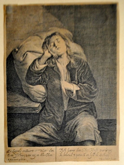 Weert, Jakob de (1569 - ) Belgien: En sovende mand. Kobberstik. Signeret. 19 x 13,7 cm.
