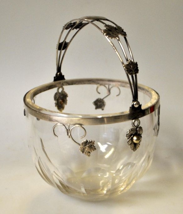 Antik dansk sukkerkumme i glas med sølv montering, 1833. Kumme med slibninger. Montering og hank i sølv. Dekoreret med vinblade. Ustemplet. H.: 9,4 cm. Dia kumme: 12,4 cm. Højde med hank: 15 cm.