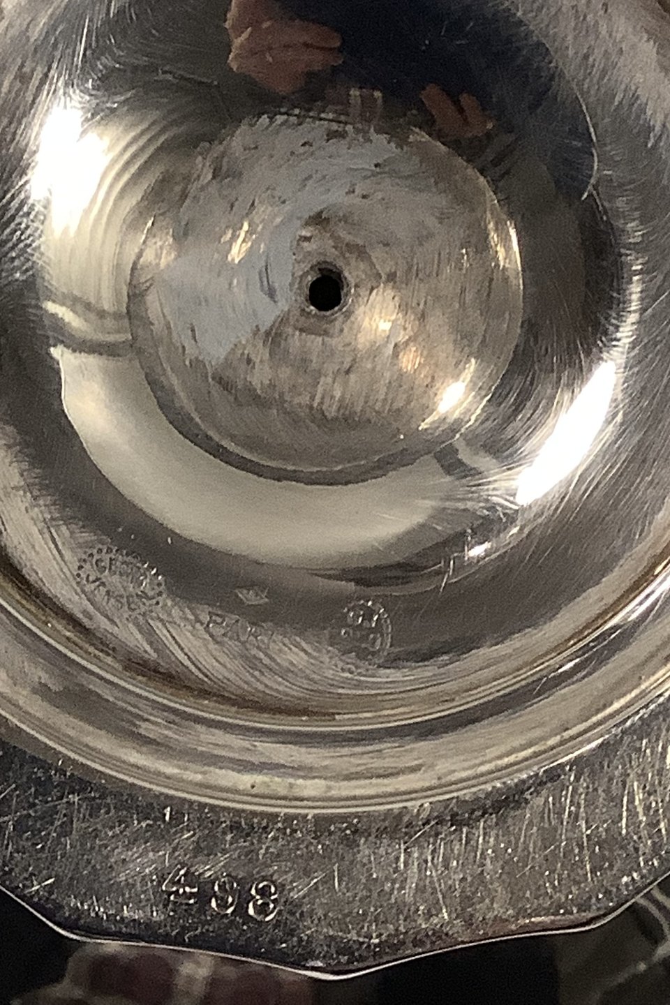 Mærket med 950, som er den franske sølv standard.. mærket med Georg Jensen, Paris.. da den er lavet i Paris under hans ophold.. men også mærket Sterling, Denmark, da den er solgt i eller til Danmark.