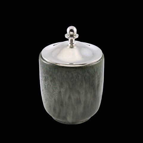 Arne Bang. Krukke i stentøj med låg i sølv.