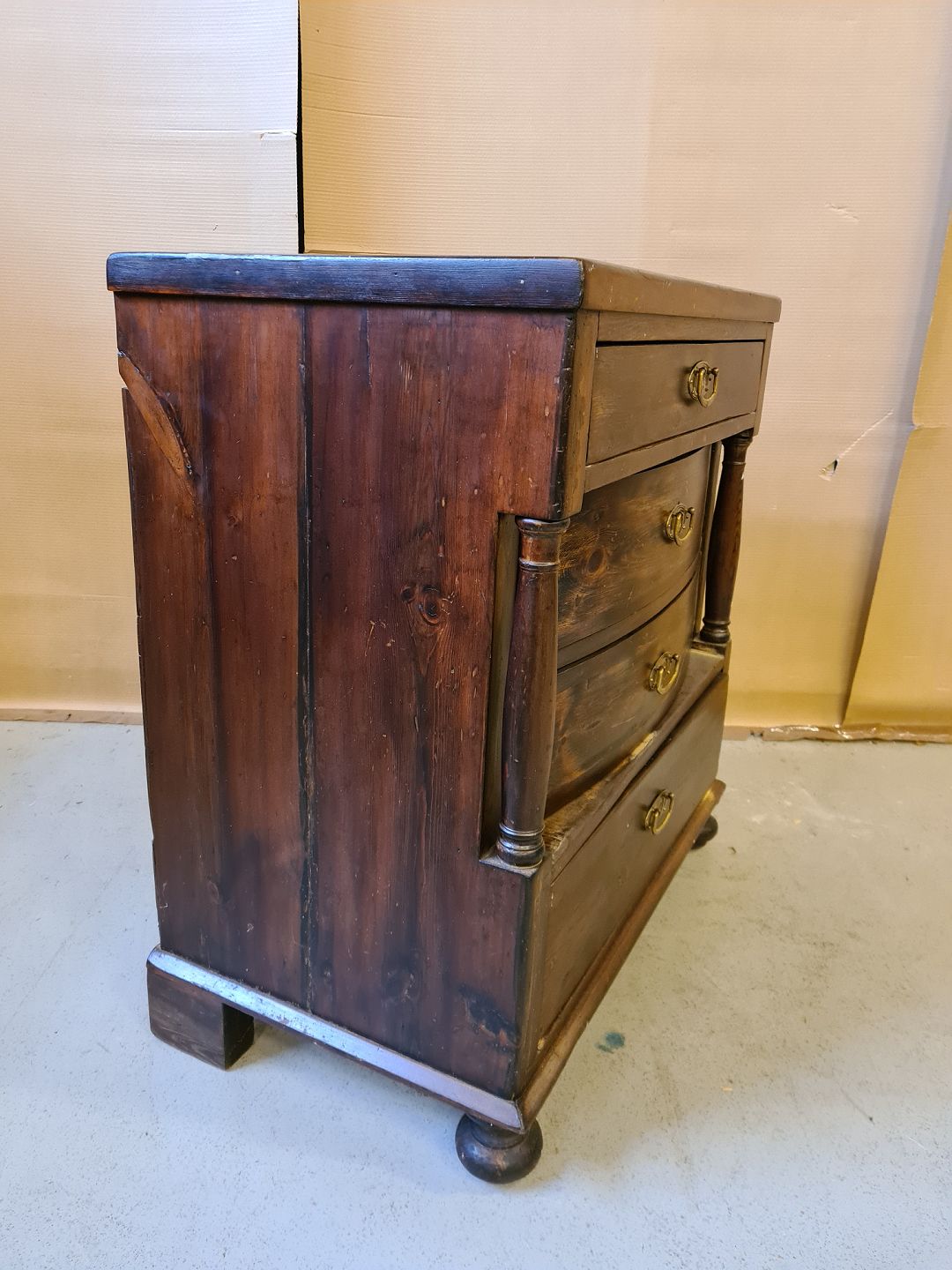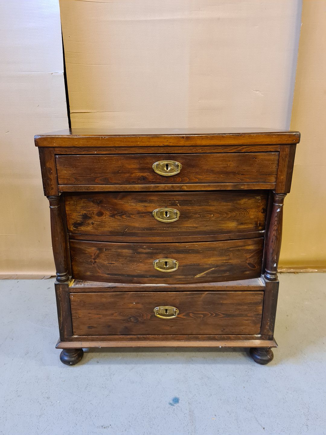 Kommode i bejset fyrretræ fra 1910erne. Den har brugsspor.