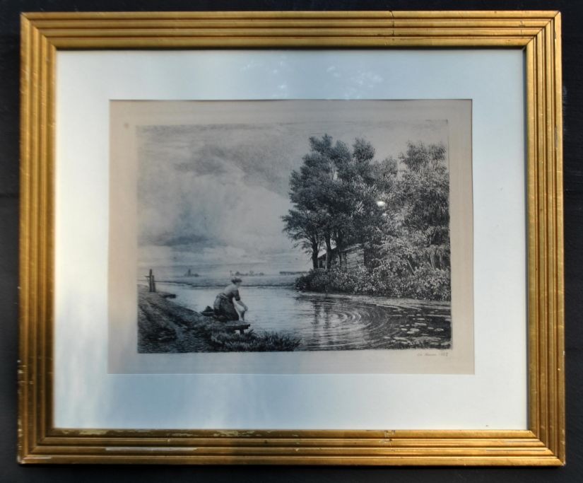 Petersen, Edvard (1841 - 1911) Danmark: Vaskescene fra Holland. Radering. Signeret 1888. Tryk: 23 x 29 cm. Indrammet: 39x 36,5 cm.