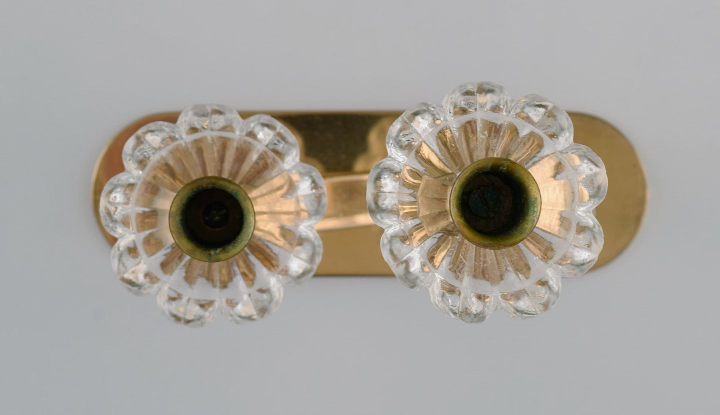 Gunnar Ander for Ystad Metall. To lysestager i messing og klart kunstglas formet som blomster. 1950'erne.
