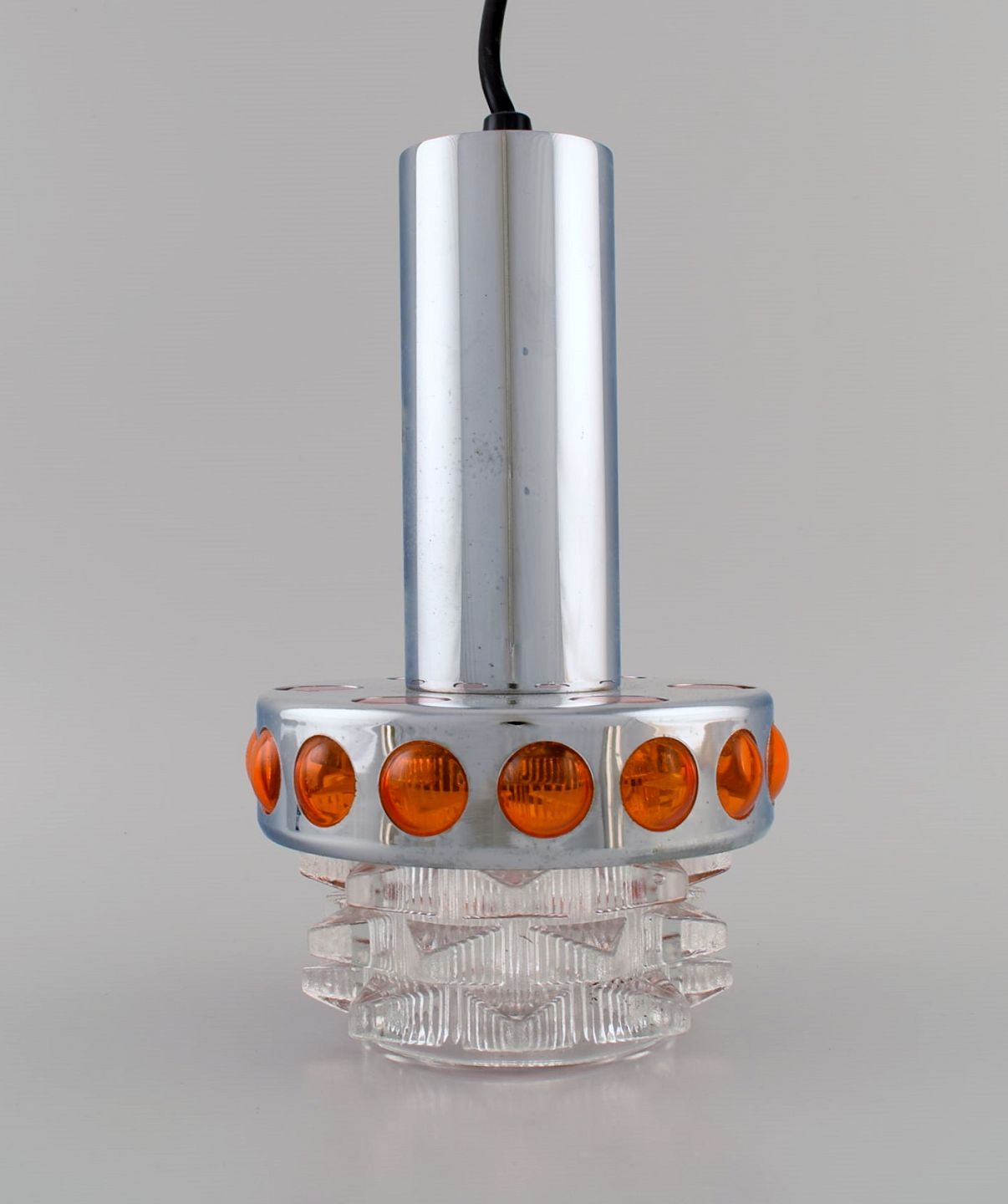 Raak, Holland. Three ceiling pendants in chromed metal and art glass. 1970s.