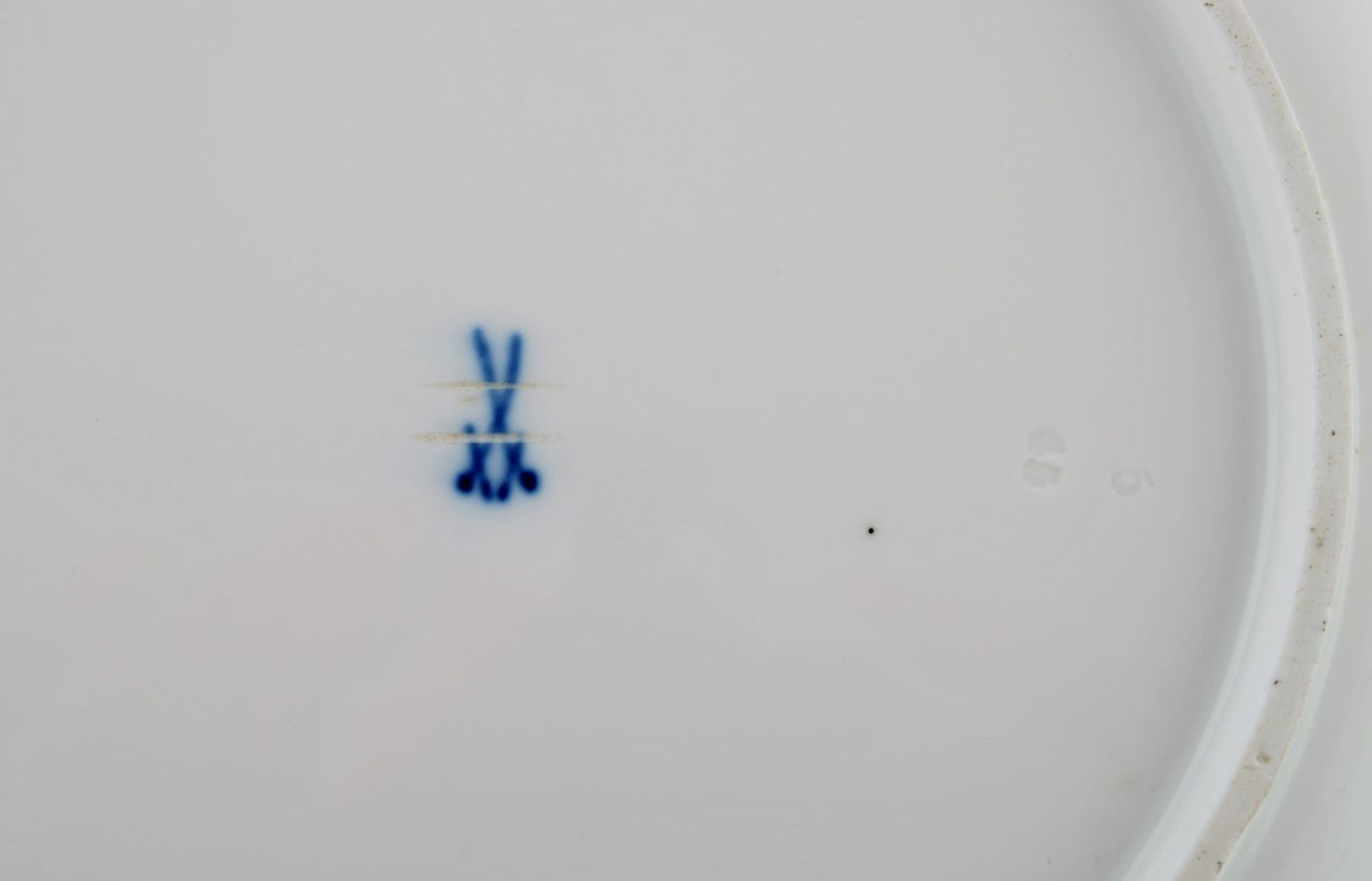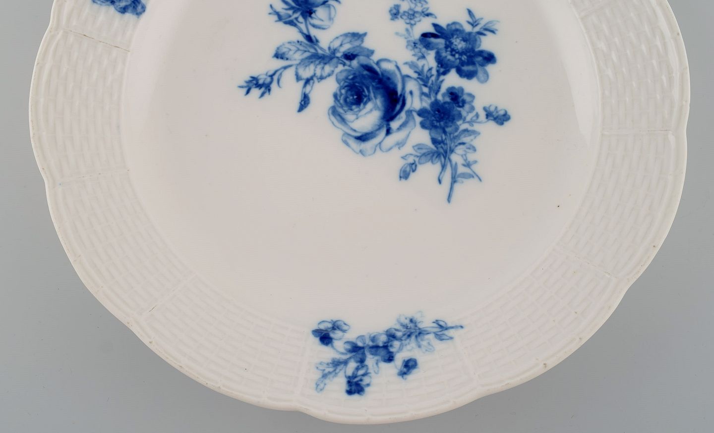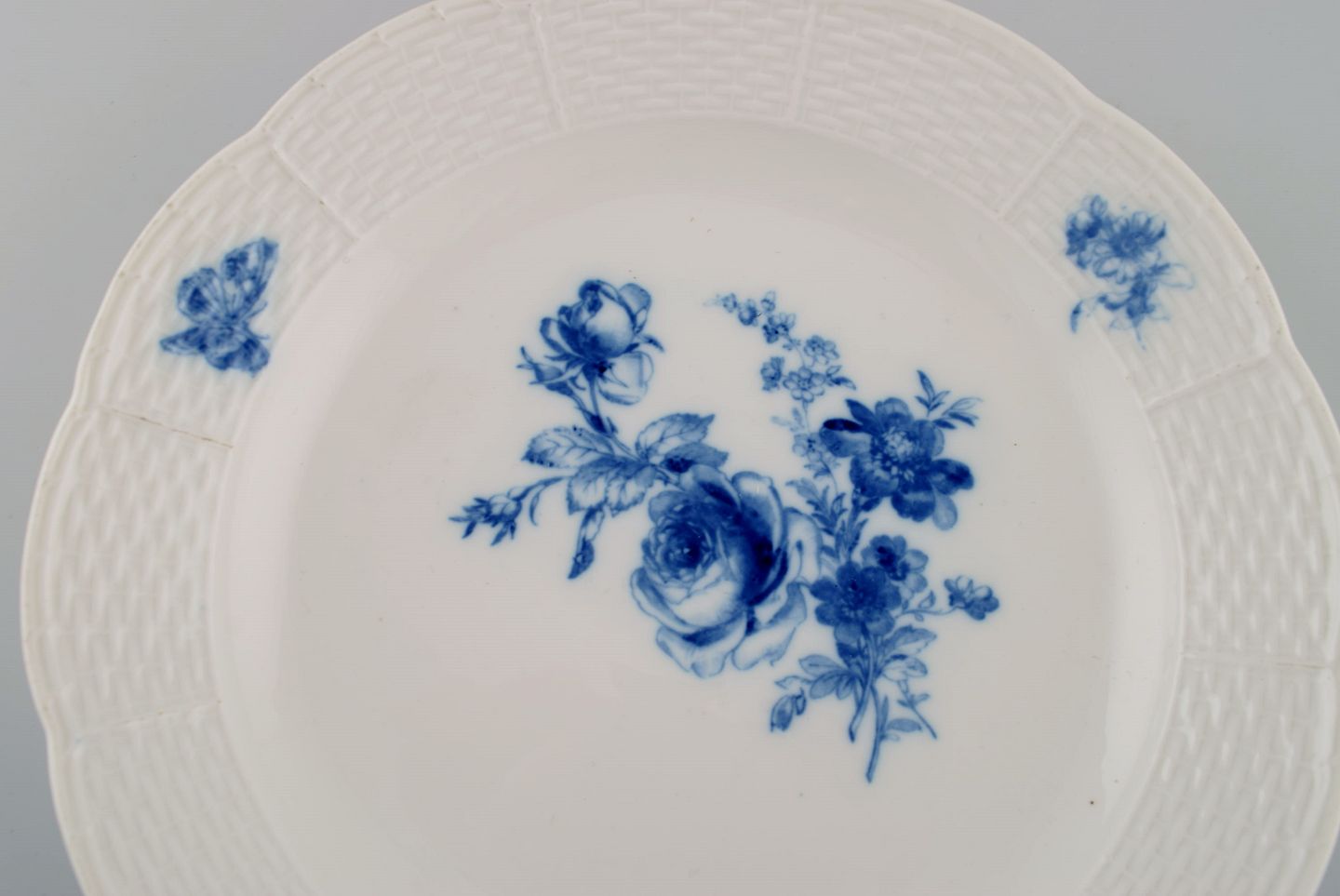 Rundt Meissen fad i håndmalet porcelæn. Sommerfugl og blå blomster. Sent 1800-tallet.