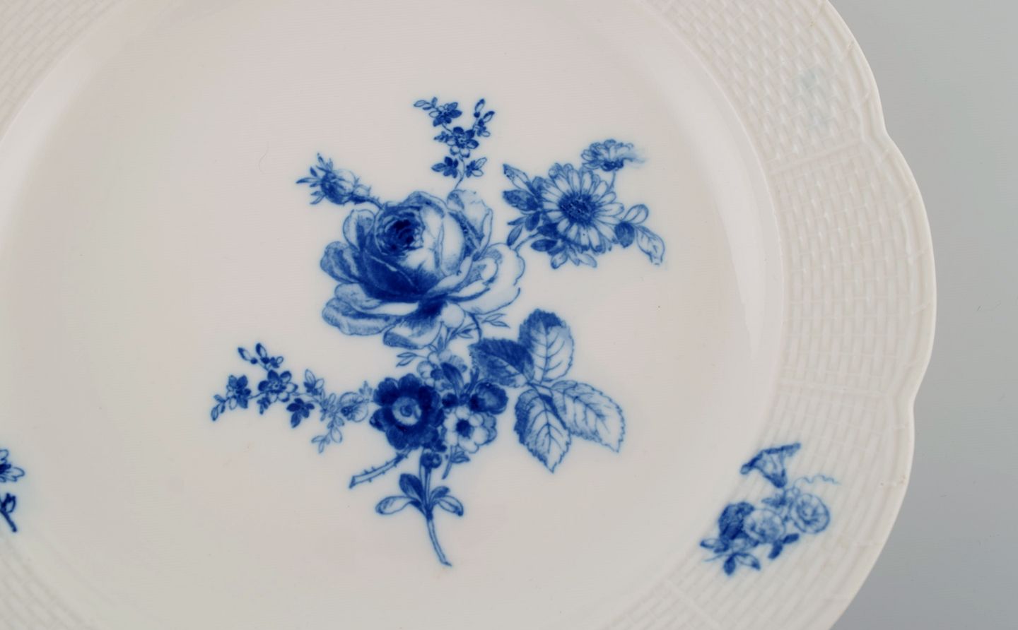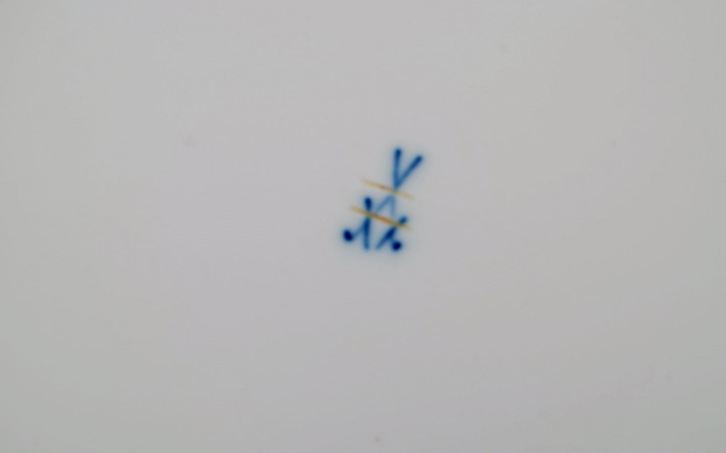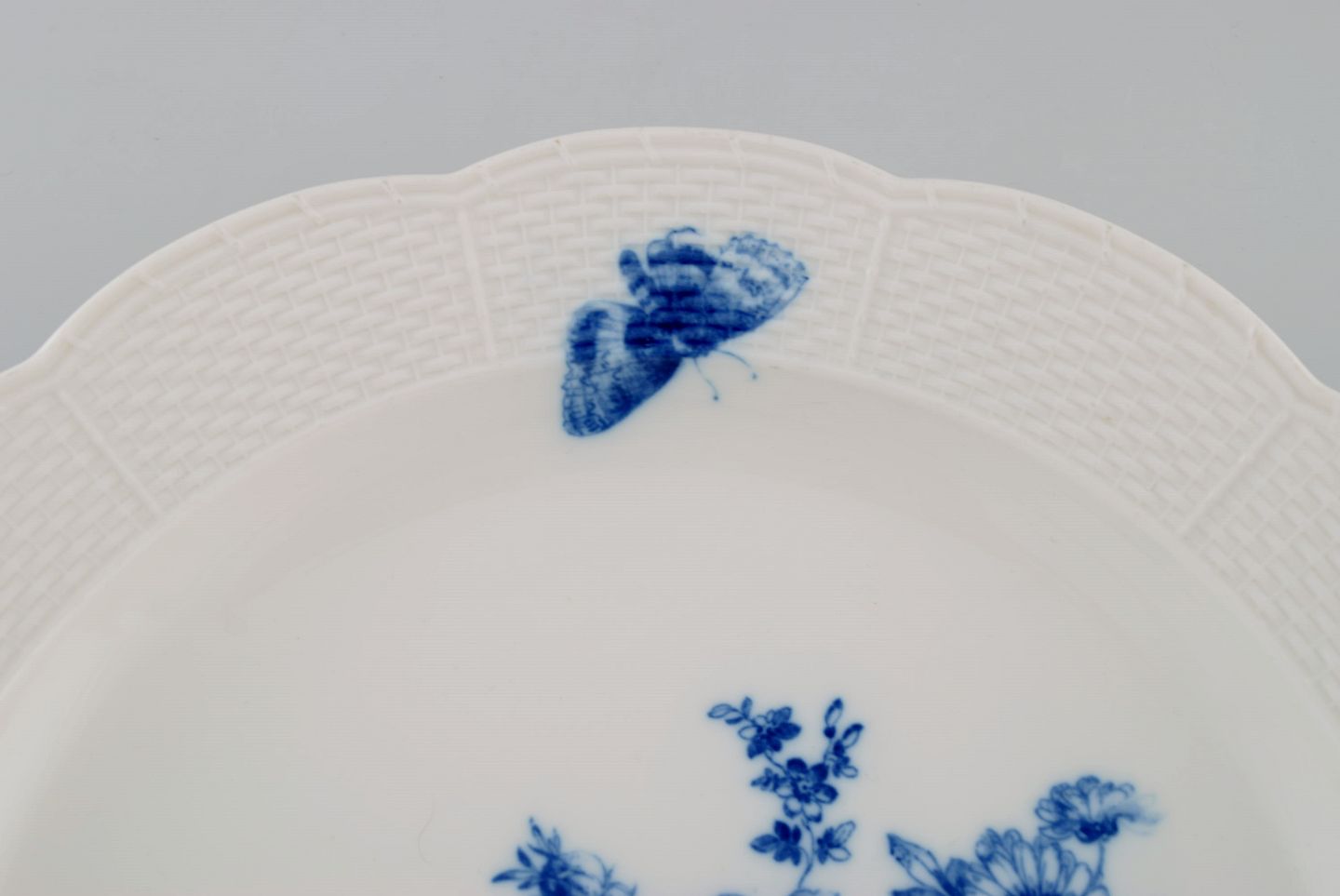 Stort rundt Meissen fad i håndmalet porcelæn. Sommerfugl og blå blomster. Sent 1800-tallet.