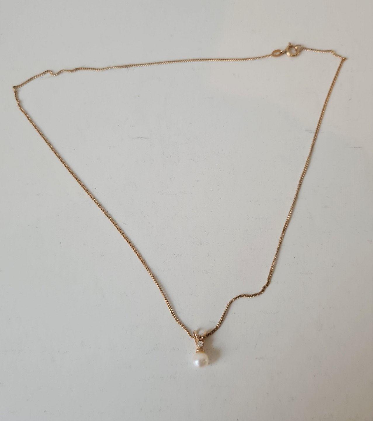 8 kt guld halskæde med vedhæng prydet med perle og zirkon