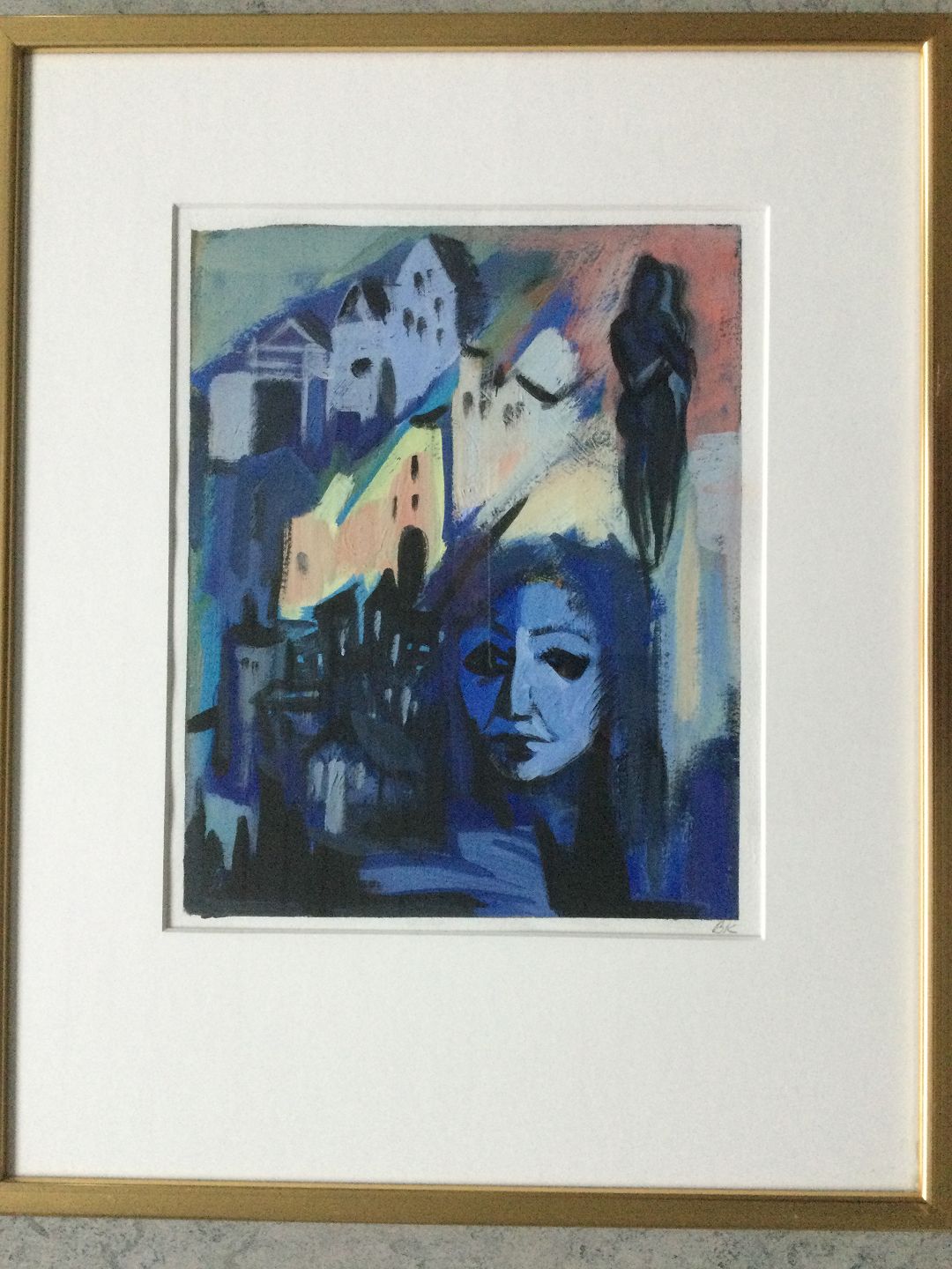 Pastel - Birthe Kjærsgaard - Komposition med kvinde, kirke og par.