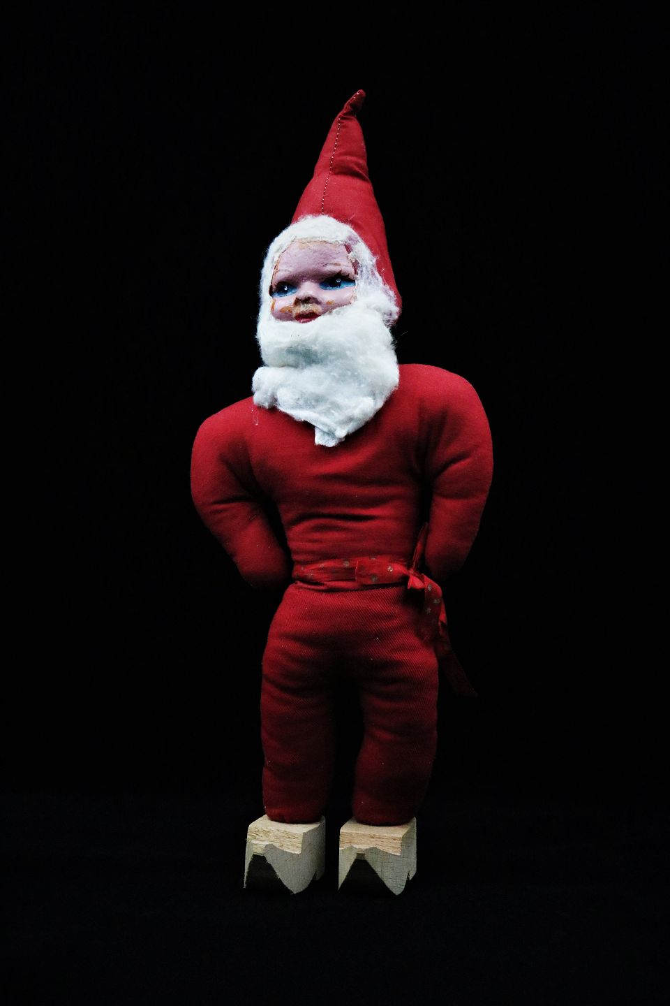 Gammel julemand i stof med bemalet papmaché ansigt , vat skæg og træsko. Højde: 42cm.