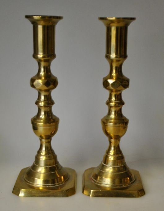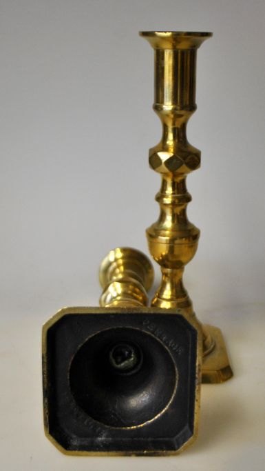 Et par engelske messing lysestager, 19. årh. Stemplet: Pebrage, England.