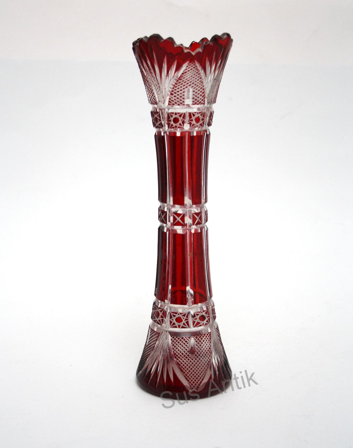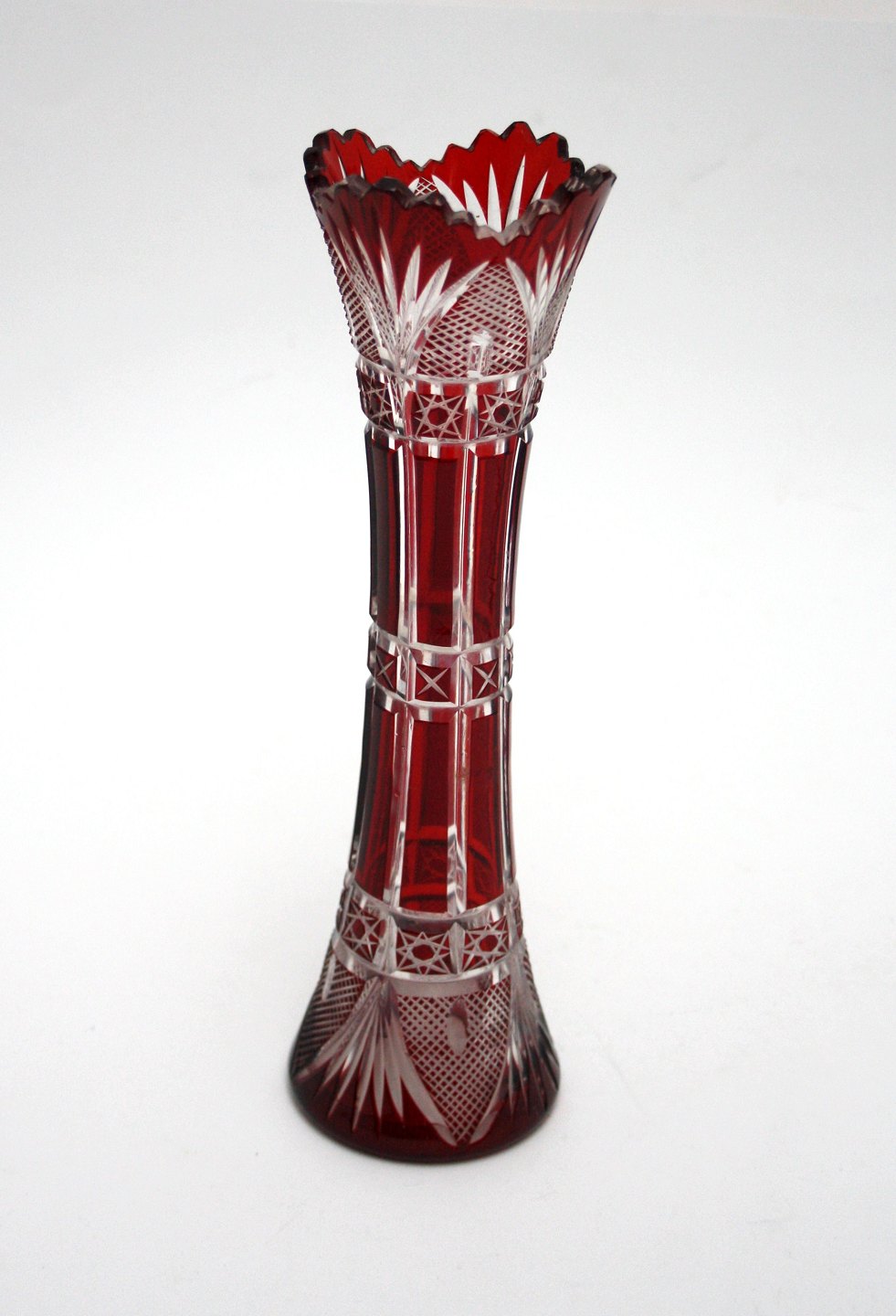 Bøhmisk krystal, Rød slank vase med slibninger. Højde 22 cm. Øverste diameter 6,3 cm. Fin stand. Pris: 300 kr.