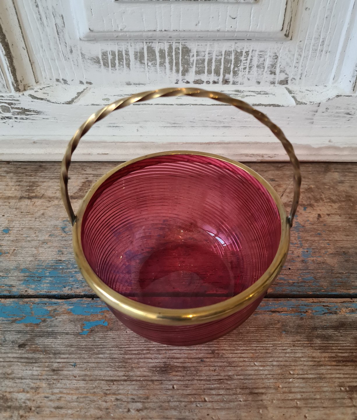 1800s sugar bowl in raspberry-colored / pink glass with brass mounting
