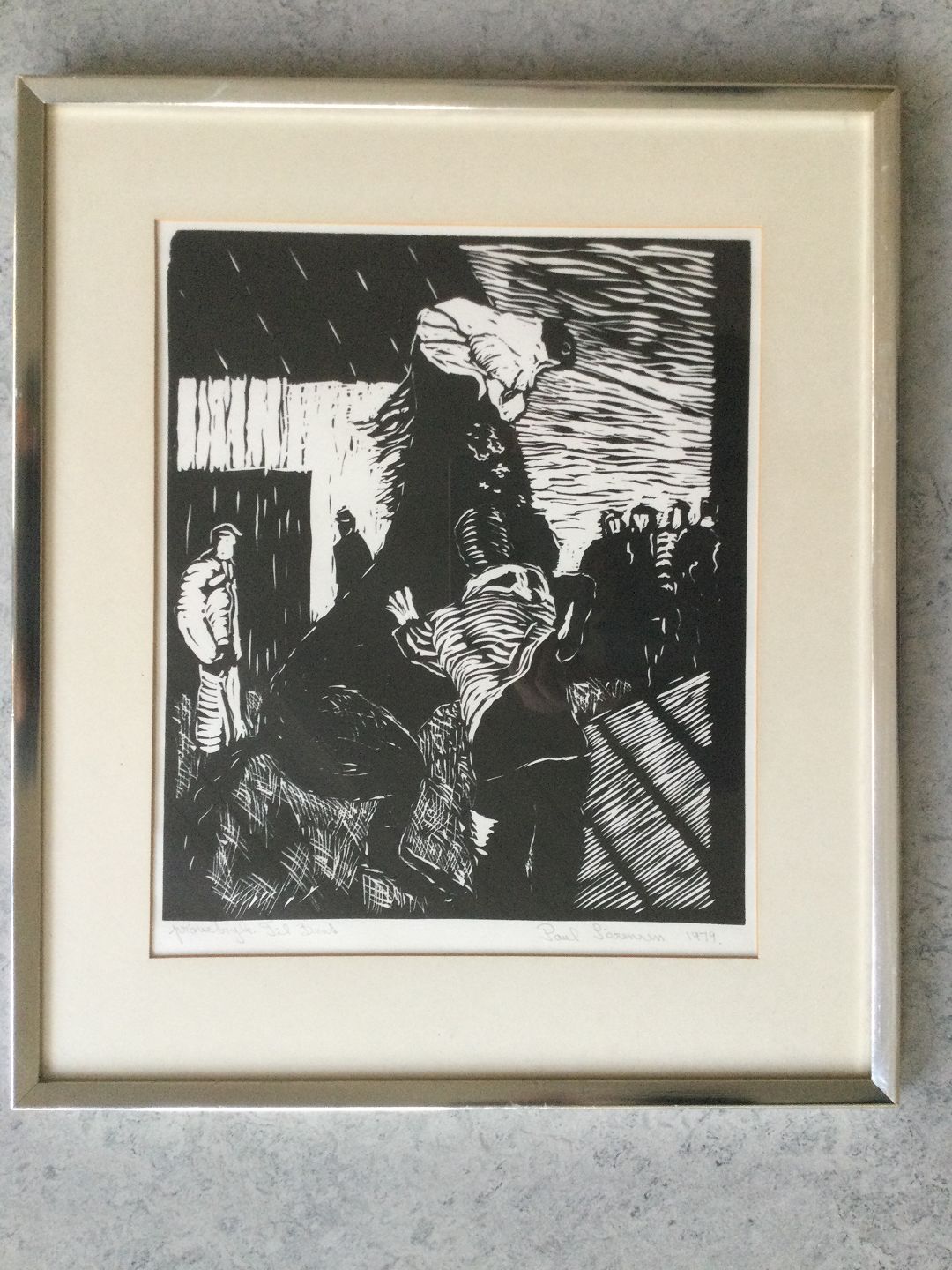 Træsnit af Poul Sørensen - Stejlende hest og personer 1979.