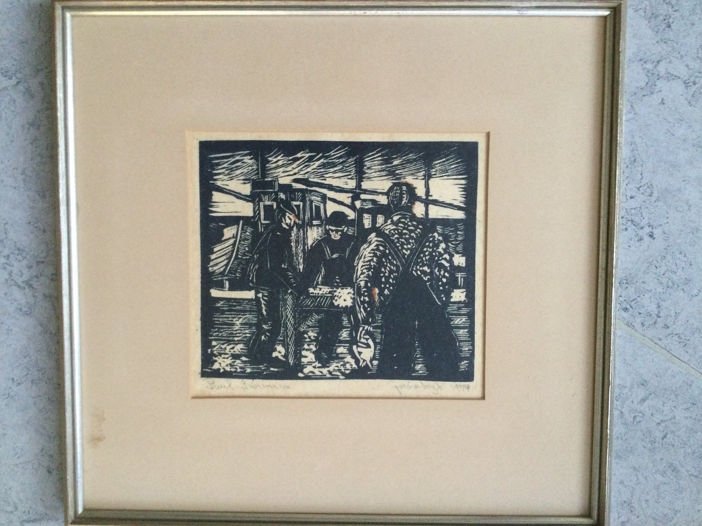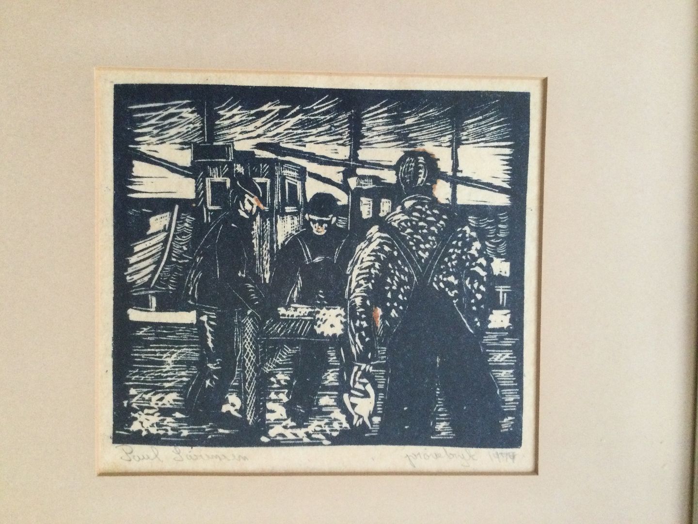 Linoleumssnit af Poul Sørensen - Fiskere i arbejde 1974.
