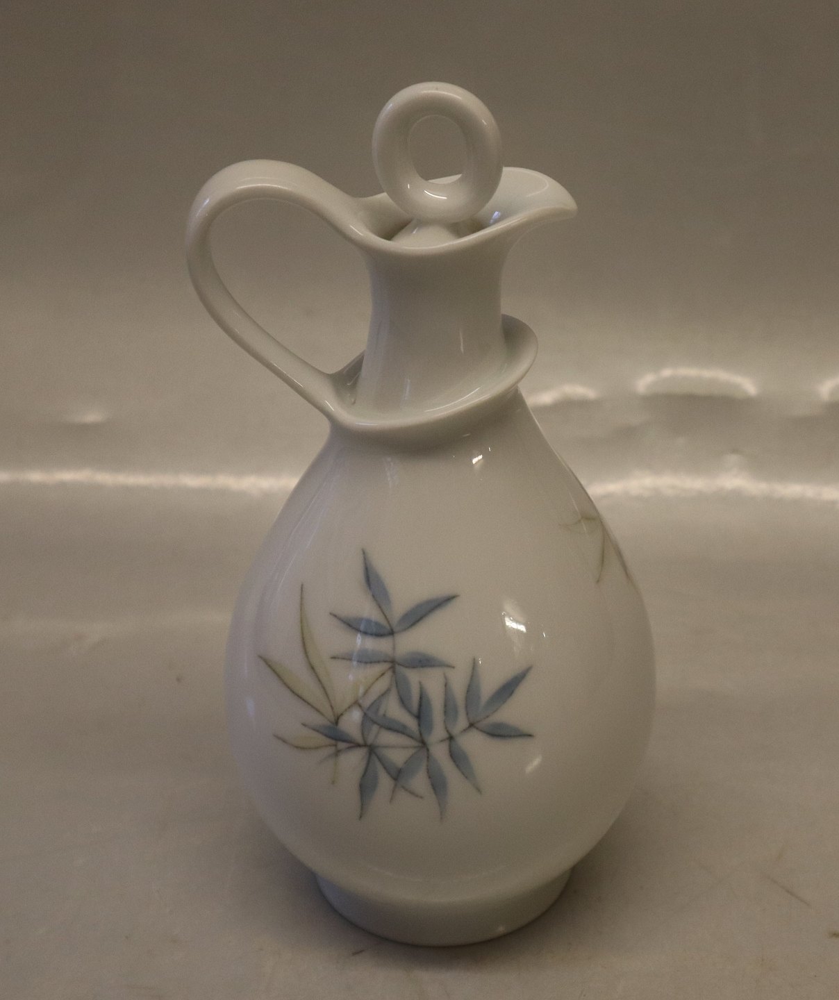 197 Flakon eddike 18 cm (386) med prop APOLLO: Hvidt porcelæn, blå og guldgrønne blade, form 676 Design Ebbe Sadolin Bing & Grøndahl I fin og hel stand.
