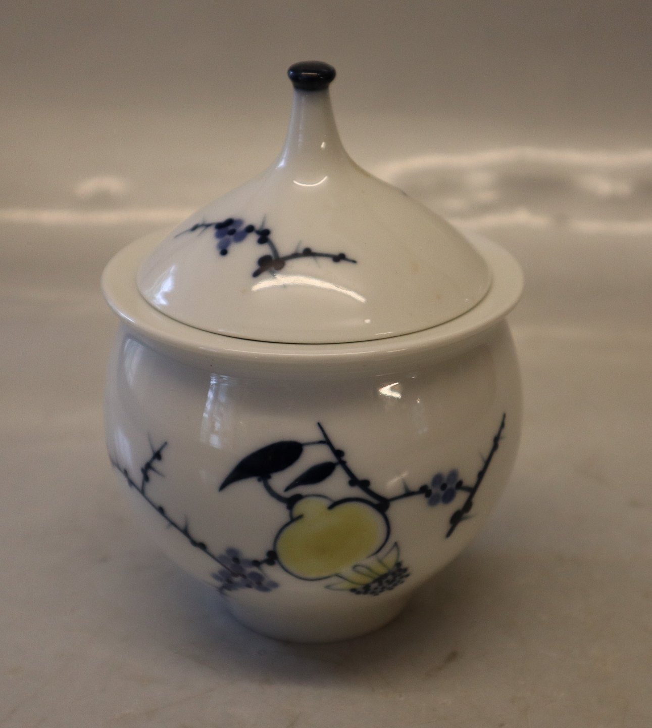 46-14839 Sukkerskål 13 cm Royal Copenhagen Rimmon Design Johannes Hedegaard. I produktion fra 1967 - 1977. Rimmon er hebræisk for granatæble. Hvidt porcelæn med gul og blå håndmalede grene. Royal Copenhagen spise - og kaffestel