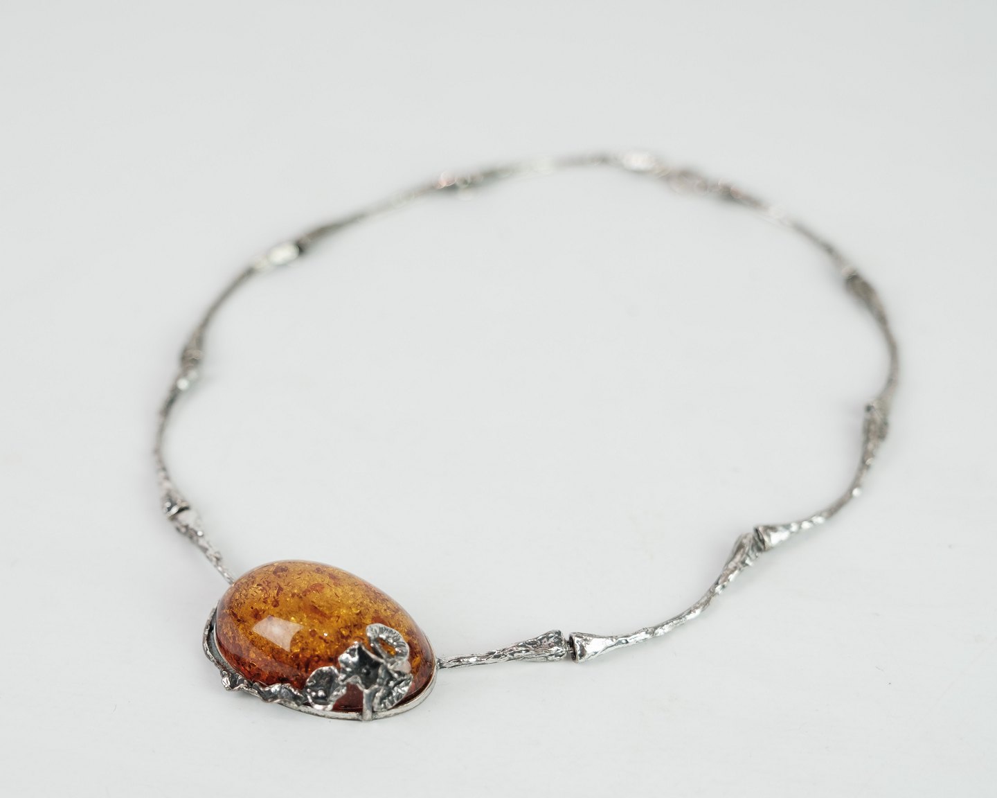 Hals collie i sølv med stor slebet rav klump prydet med sølv blomster