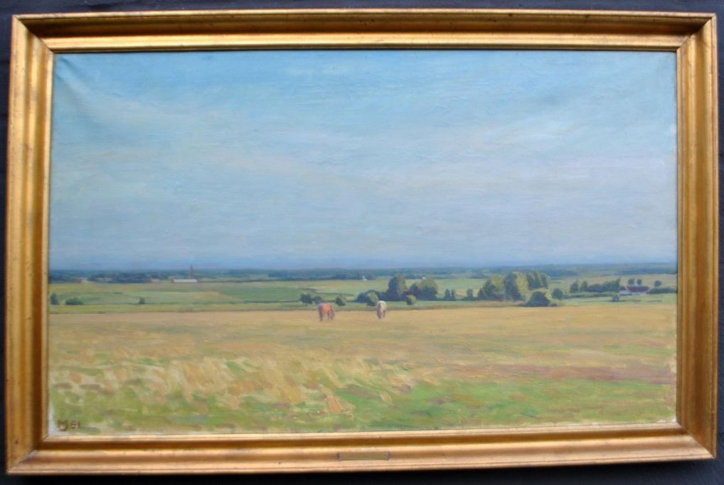 Hindevad, Peter Marius Jensen (1885 - 1977) Danmark: Udsigt fra Rækkehusene mod Hemmerslev - Særslev. Olie på lærred. Signeret 1951. 45 x 74 cm.