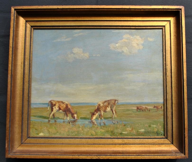 Lassen, Aksel M. (1869 - 1946) Danmark: Køer på Saltholm. Signeret 1946. Olie på lærred. s0 x 29 cm.