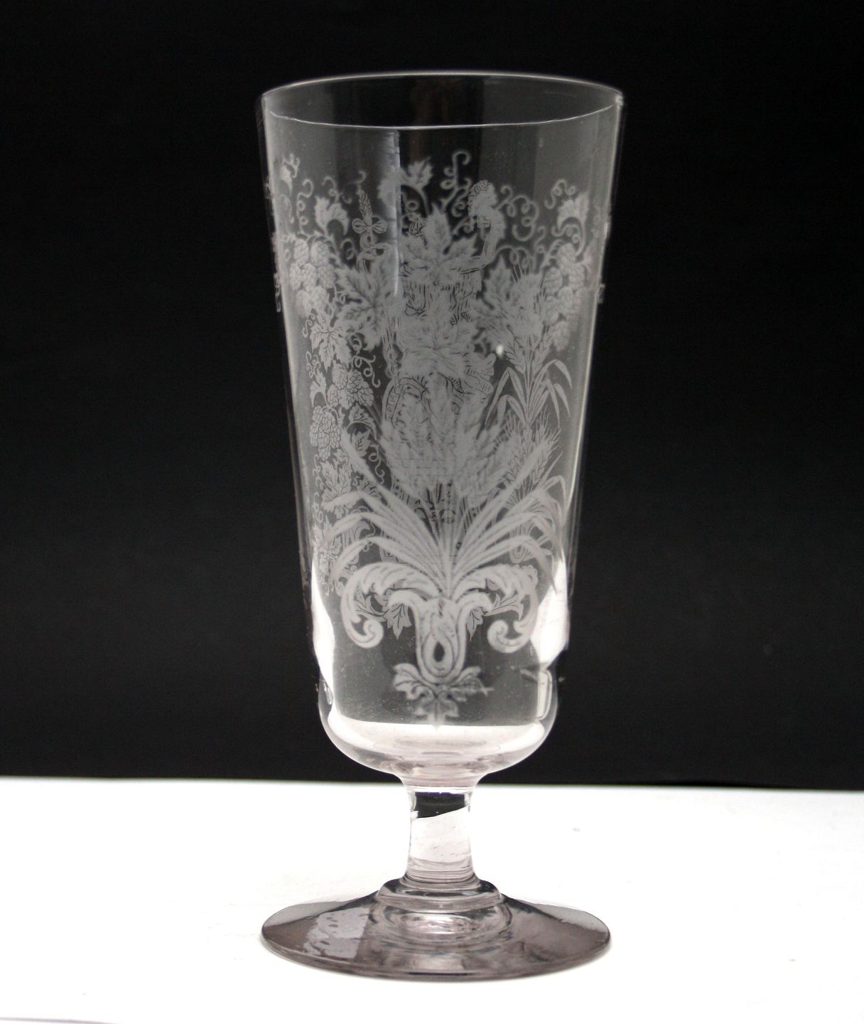 Porterglas med statue og blomstermotiv, rundslebet i bund. Højde 18 cm. Øverste diameter ca. 8 cm. Pris: 350 kr.
