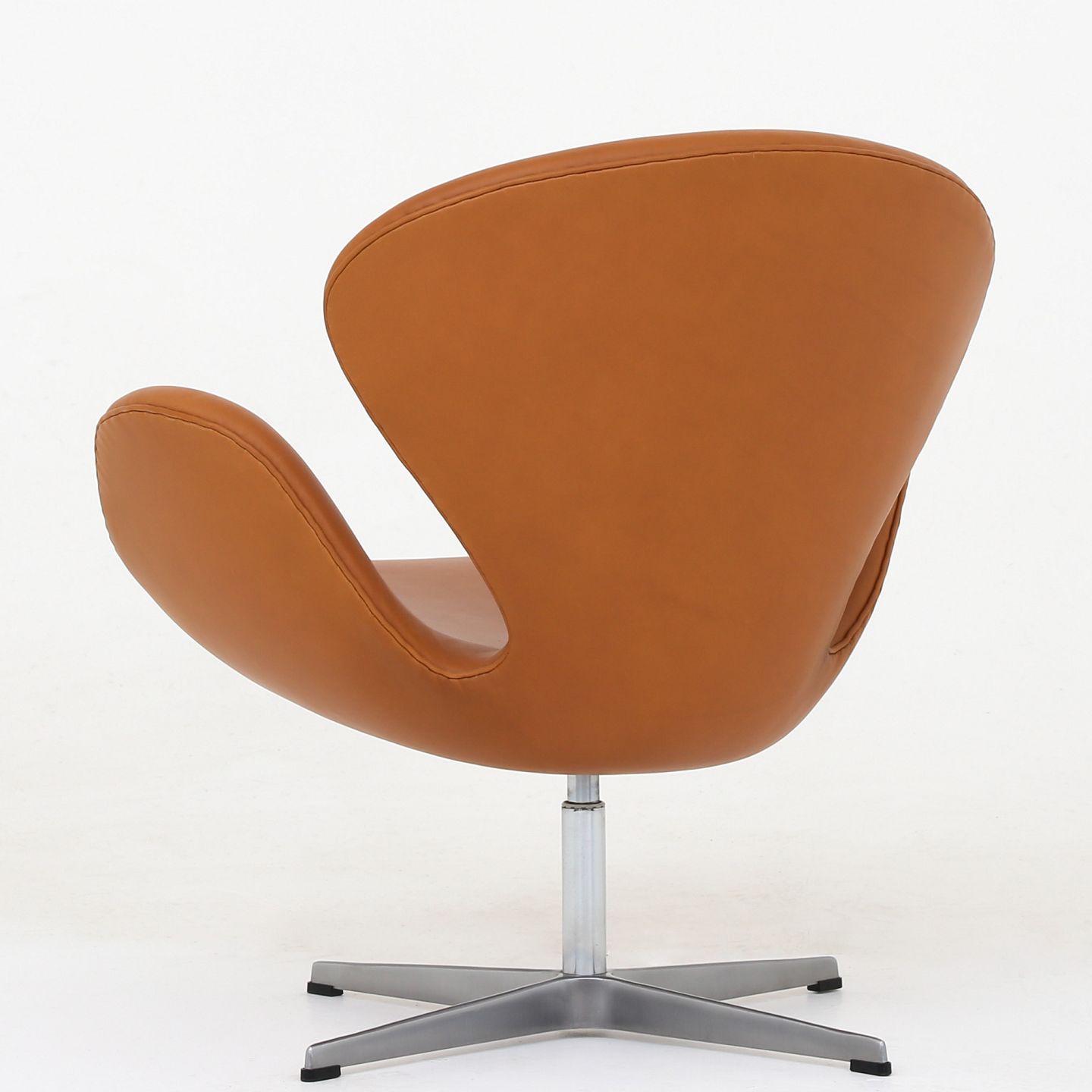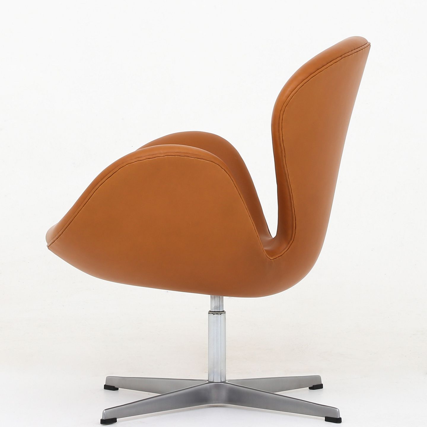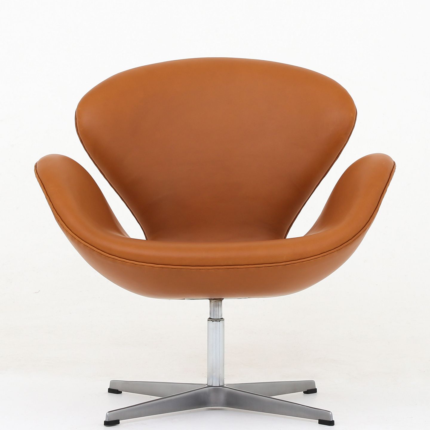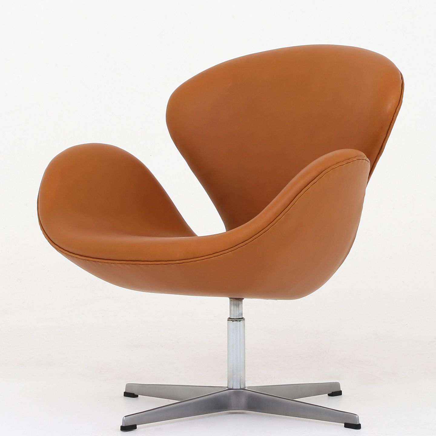 AJ 3220 - Nybetrukket 'Svanen' i Klassik Cognac anilin-læder på gl. fod af aluminium med returdrej.