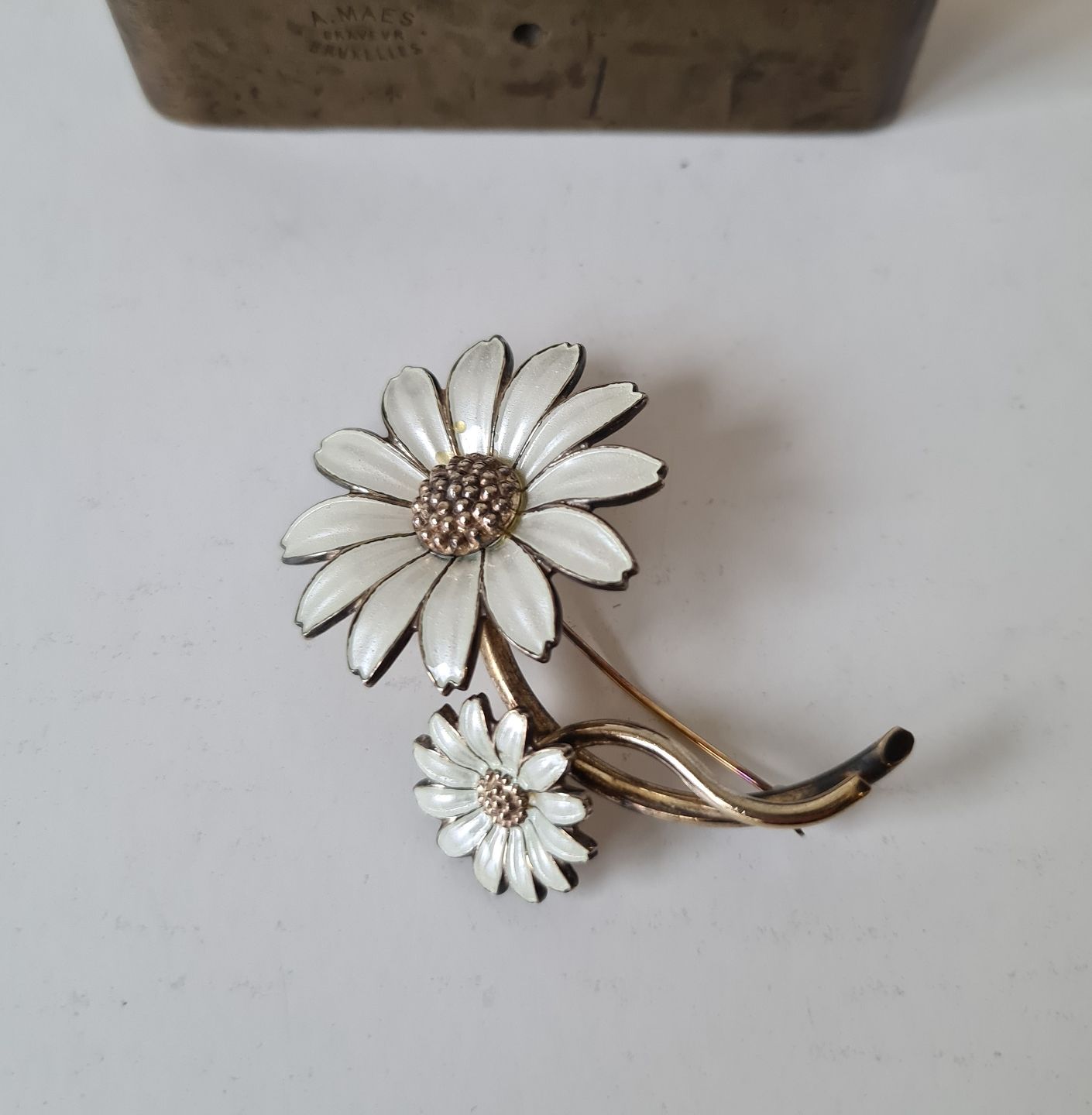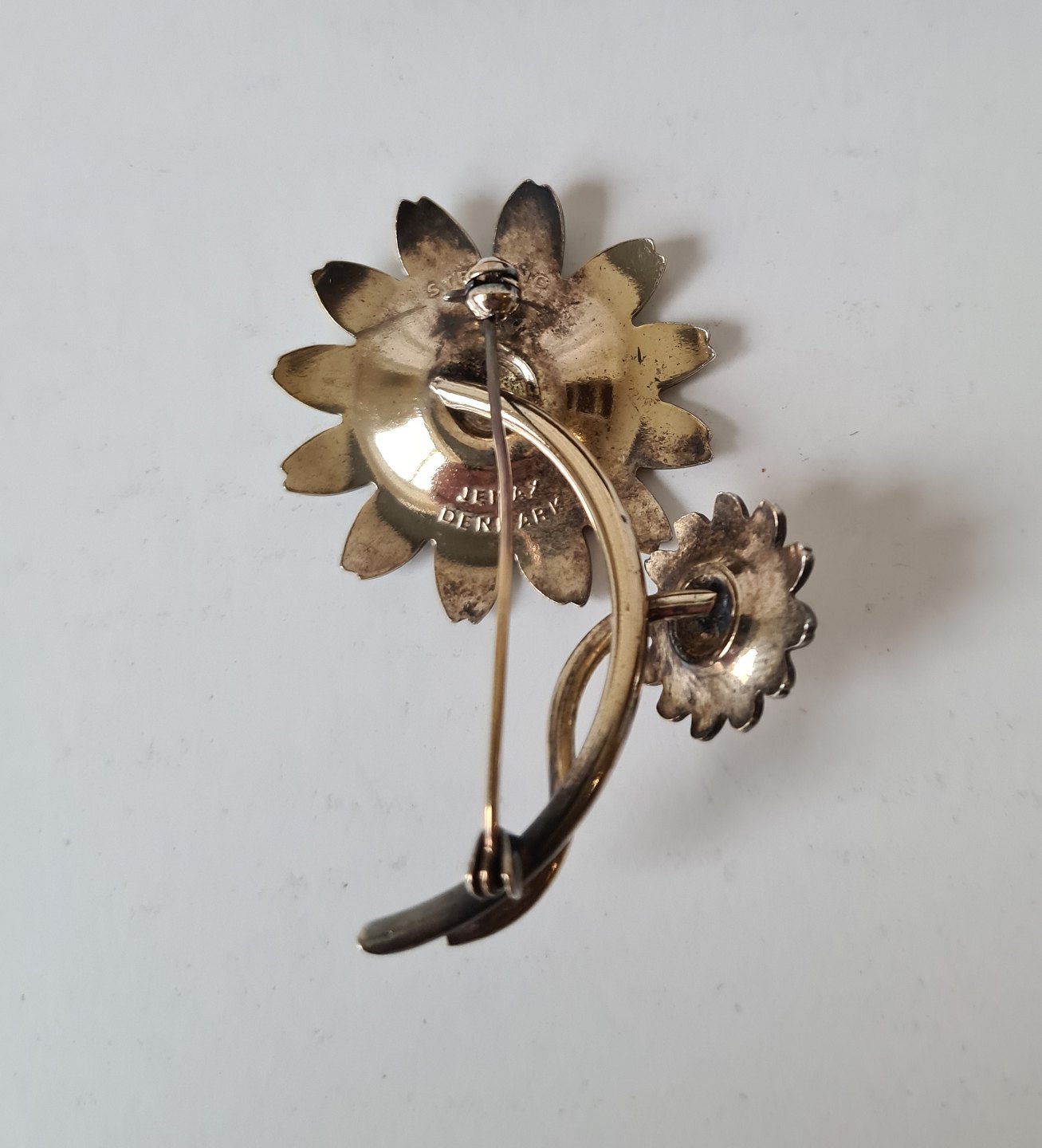 Vintage broche med to blomster i forgyldt sterlingsølv og emalje