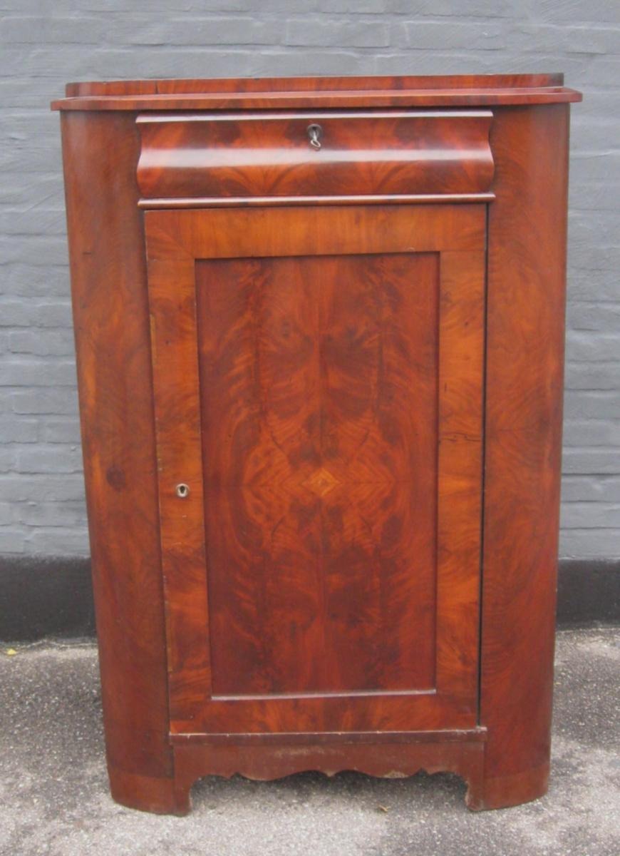 Senempire hjørneskab i mahogni, ca.1860, Danmark. Med skuffe foroven og låge med hylder. Med reparationer. H.: 140 cm. B.: 90 cm. D.: 50 cm.
