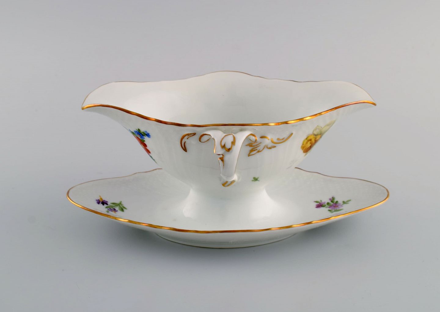 Royal Copenhagen Saksisk Blomst sovsekande i håndmalet porcelæn med blomster og gulddekoration. Modelnummer 493/1650. Tidligt 1900-tallet.