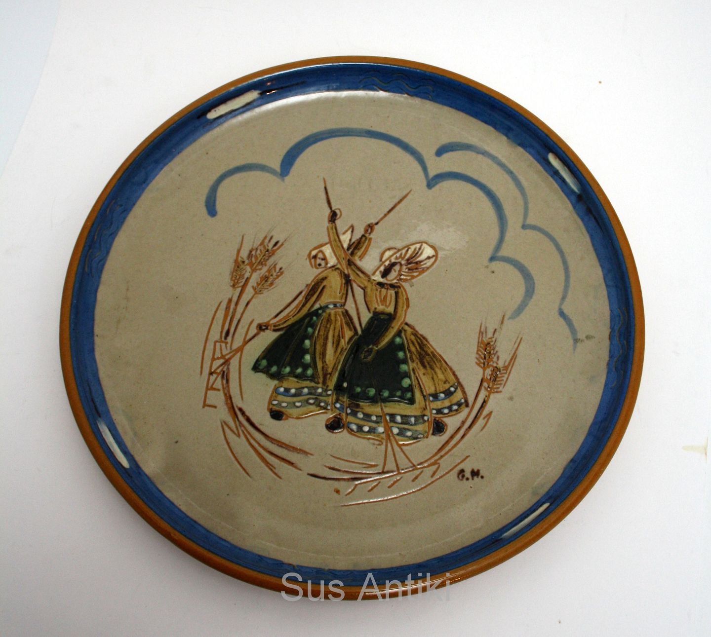 Knabstrup, Danmarkstellet produceret ca 1945-1953, gildestel designet af Aksel Sigvald Nielsen, der var kunstnerisk leder på malerstuen på Knabstrup. Stort fad med kvindelige høstarbejdere. Diameter 31 cm. Højde ca 2,5 cm. Fin stand. Pris: 550 kr.