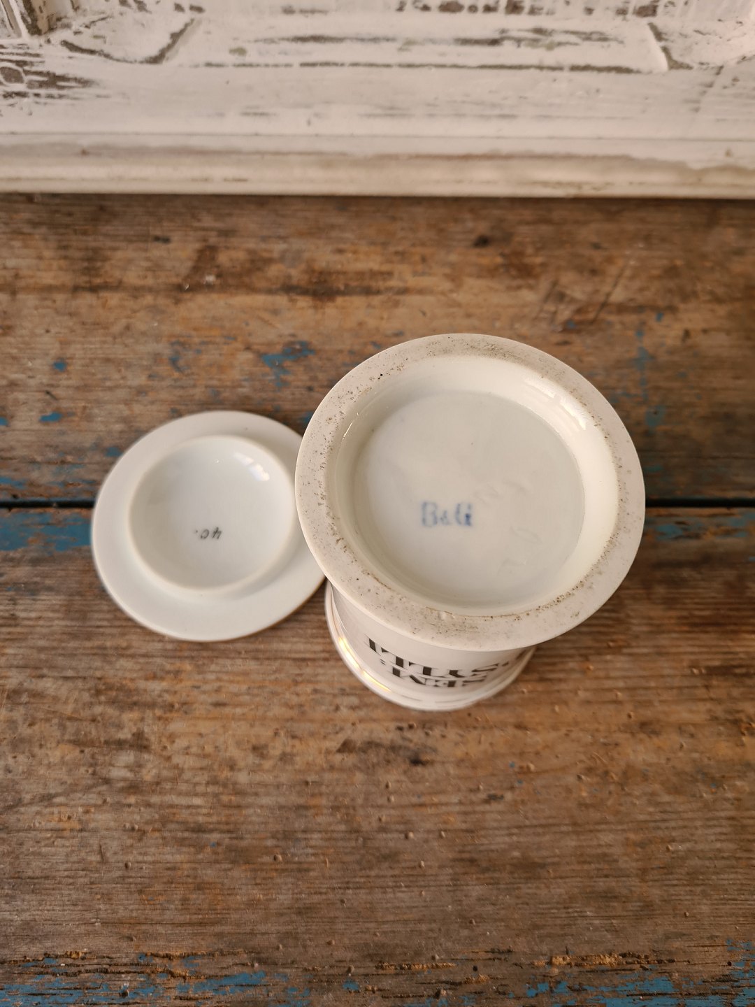 B&G Apotekerkrukke i hvidt porcelæn med guldkant og sort skrift