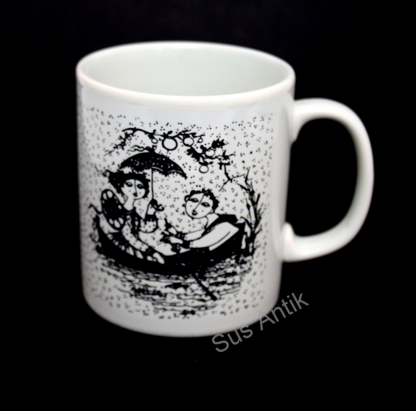 Nymølle, Bjørn Wiinblad. Juli, Nocturne. Månedskrus er ligesom månedsplatterne produceret med 12 forskellige motiver med årets gang for et kærestepar. Sort/hvid. Højde 9 cm. Diameter 8 cm. Pris: 125 kr. stk. Lager: 1